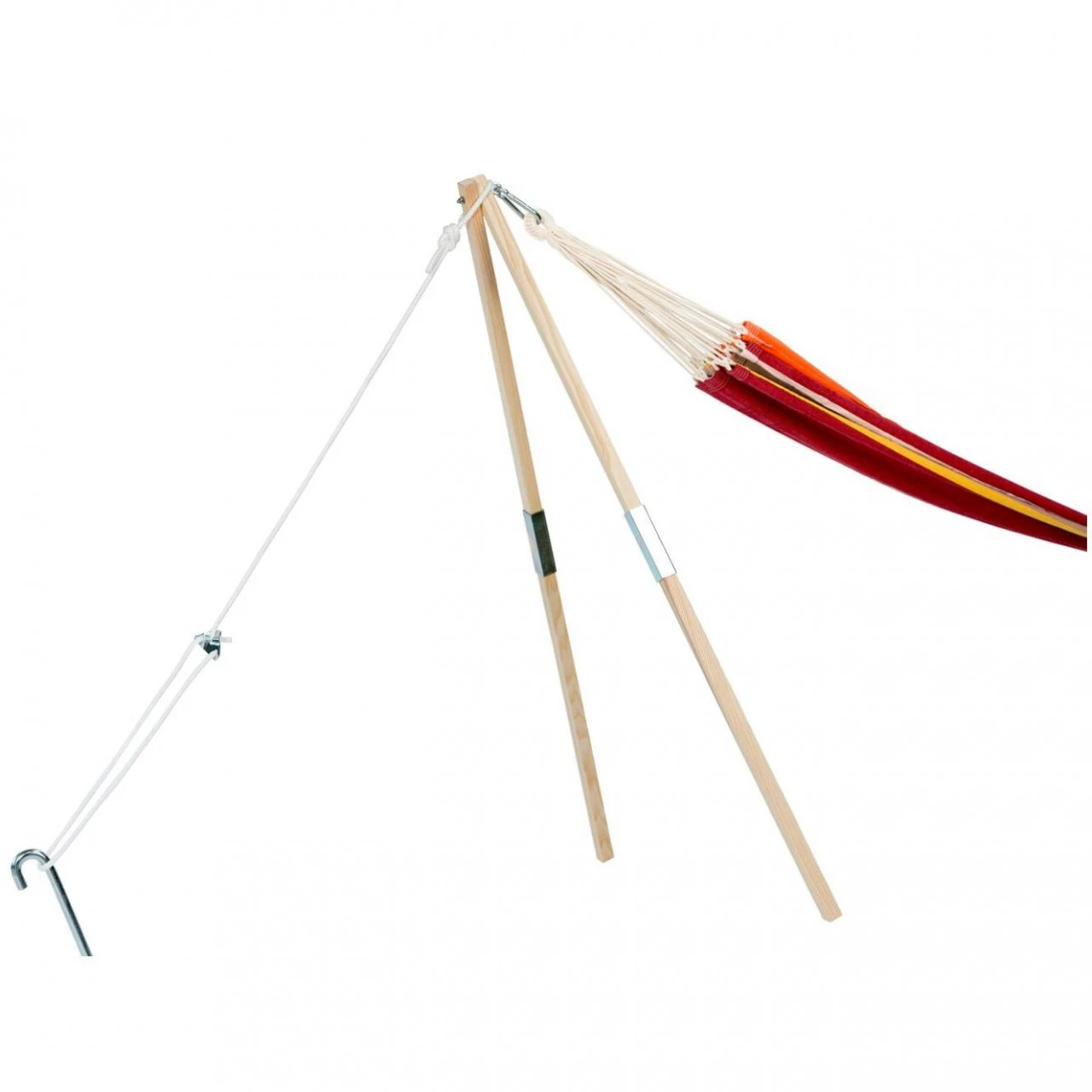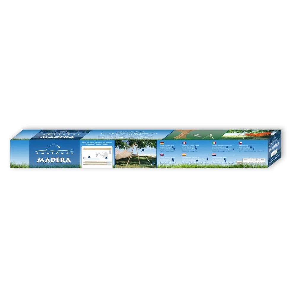 Das Standardproblem beim Aufhängen einer Hängematte: Der zweite Baum fehlt. Das Amazonas Hängemattengestell Madera löst dieses Problem. Eine Seite der Hängematte wird wie gewohnt am Baum oder an der Hauswand befestigt, auf der anderen Seite der Hängematte befindet sich das wetterfeste Eschenholzgestell, das über einen Erdnagel fest im Boden verankert wird. Die zweite Seite der Hängematte kann nun schnell und einfach in das Amazonas Hängemattengestell Madera eingehängt werden. Besonders praktisch: Das Gestell lässt sich ohne Schrauben in Einzelteile zerlegen und ist so besonders gut zu transportieren. Das Amazonas Hängemattengestellt Madera ist mit allen Amazonas Hängematten verwendbar.