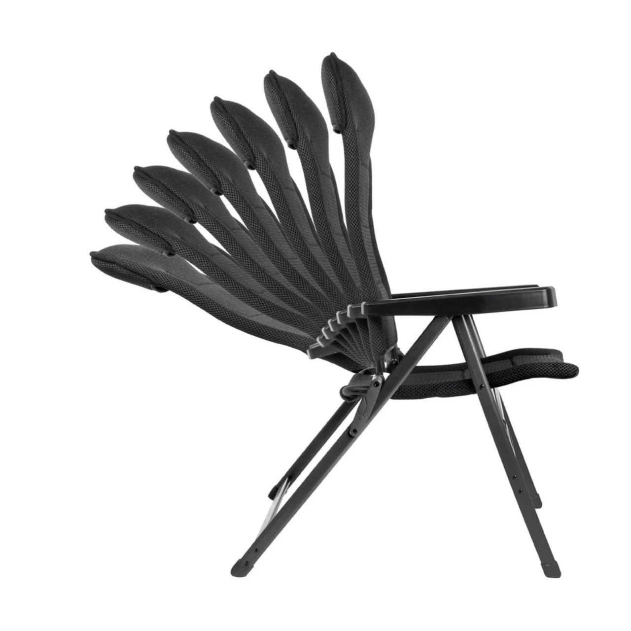 Der Aravel Vitachic ist mit einer 7-fach verstellbaren hohen Rückenlehne ausgestattet. Wenn du die Lehne ganz zurückstellst und den optional erhältlichen Aravel Vitachic Standalone benutzt, kannst du fast auf deinem Stuhl liegen. Bezogen ist er mit dem hochwertigen „3Durafeel Pro“ Stoff. Dieses Material ist luftdurchlässig und sorgt für ein angenehmes Sitzgefühl im Freien. Wenn du den Stuhl im Regen vergessen solltest, dann trocknet er sehr schnell wieder. Die UV-Beständigkeit des „3Durafeel Pro“ verlängert die Lebenszeit deines Brunner Aravel Vitachic Klappstuhls. Der leichte Klappmechanismus aus Aluminium sorgt für ein schnelles und problemloses Auf- und Zusammenklappen.