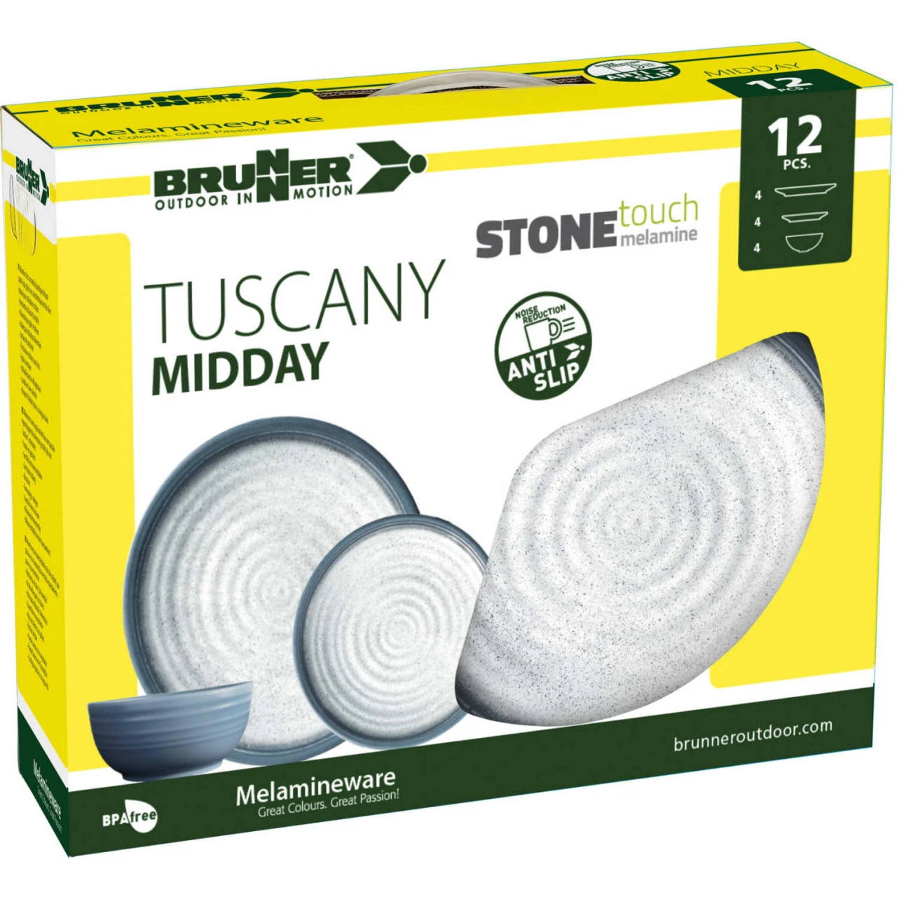 Das Brunner Midday Tuscany ist ein 12-teiliges Geschirr-Set aus STONEtouch® Material. Hierbei handelt es sich um ein neu entwickeltes Melamin/Mineralgemisch, was hervorragend funktionelle Eigenschaften hat. Es ist selbstverständlich lebensmittelecht und BPA-frei. Das neue ist aber, dass dieses Material wie Porzellan glänzt und sich auch fast so anfasst. Die Geschirrteile können in der Spülmaschine gereinigt werden und sind tiefkühlgeeignet.