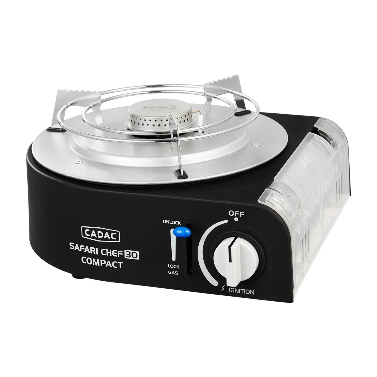 Der Cadac Safari Chef 30 Compact Gasgrill ist der ideale Begleiter für Outdoor-Aktivitäten und Campingurlaube. Er arbeitet mit einer 227g Bajonettkartusche, die ganz einfach ins Gerät eingesetz wird. Trotz seiner geringen Größe ist der Safari Chef 30 Compact äußerst vielseitig, da er über verschiedene Kochflächen verfügt – einen Topfständer, eine Grillplatte, ein Grillrost und einen Deckel, der als Topf genutzt werden kann. Auf dem Topfständer kannst du problemlos einen Topf mit Suppe oder Nudeln kochen. Der Grillrost und die Grillplatte sind mit der GreenGrill-Beschichtung von Cadac versehen und eignen sich perfekt zum Braten und Grillen von Fleisch, Fisch und Gemüse. Der Deckel kann auch als (Suppen-)Topf verwendet werden und ist somit multifunktional. Die Tropfschale fängt Kochrückstände auf, wenn du den Grillrost benutzt, dient aber auch als Windschutz, damit der Brenner nicht ausbläst.