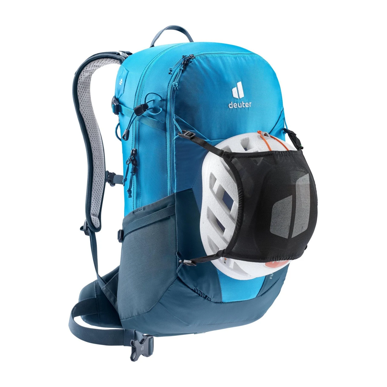 Der Deuter Futura 23 Wanderrucksack eignet sich ideal für Deine Tagestouren. Der Rucksack wurde besonders nachhaltig produziert und 50% seines Garns besteht aus recyceltem Rohstoff. In der Futura-Serie besteht das Hauptmaterial aus zertifiziertem Bluesign©. Der Rucksack lässt sich besonders bequem durch seine beweglichen ActiveFit Schulterträger tragen. Durch das gut belüftete Aircomfort-Rückensystem mit luftdurchlässigem Mesh schwitzt Du bei Deinen Touren deutlich weniger. Zu den weiteren Ausstattungsmerkmalen des Futura 23 gehören unter anderem eine Helmhalterung mit der du Deinen Helm am Rucksack befestigen kannst und eine luftige Frontstecktasche, in der Deine nassen Anziehsachen schnell trocknen können. Ein großes Organisationsfach vorne und elastische Seitentaschen bieten Dir viel Stauraum für Deine persönlichen Gegenstände, die Du bei dir führen möchtest. Außerdem ist der Futura 23 mit einem Trinksystem kompatibel und besitzt eine abnehmbare Regenhülle.
