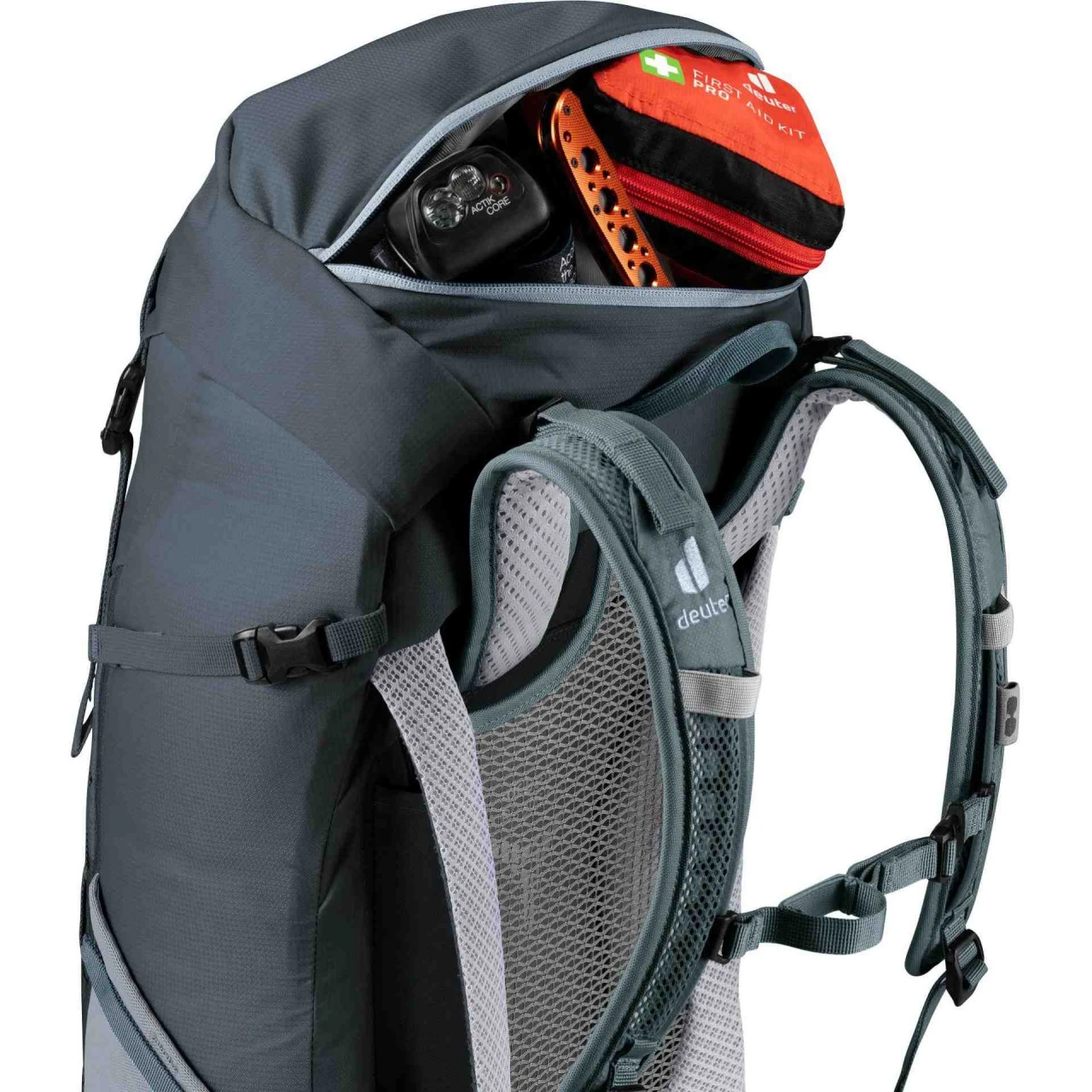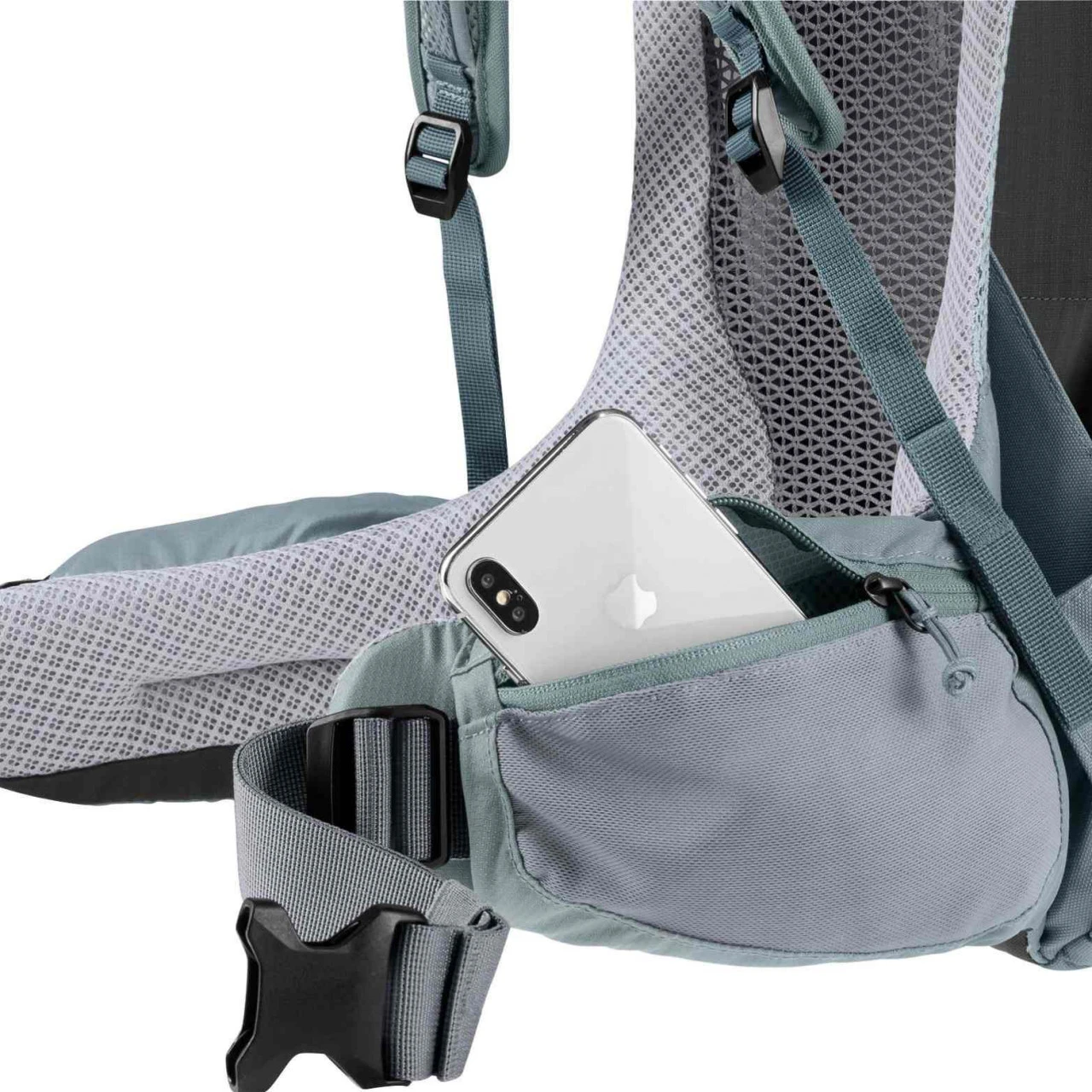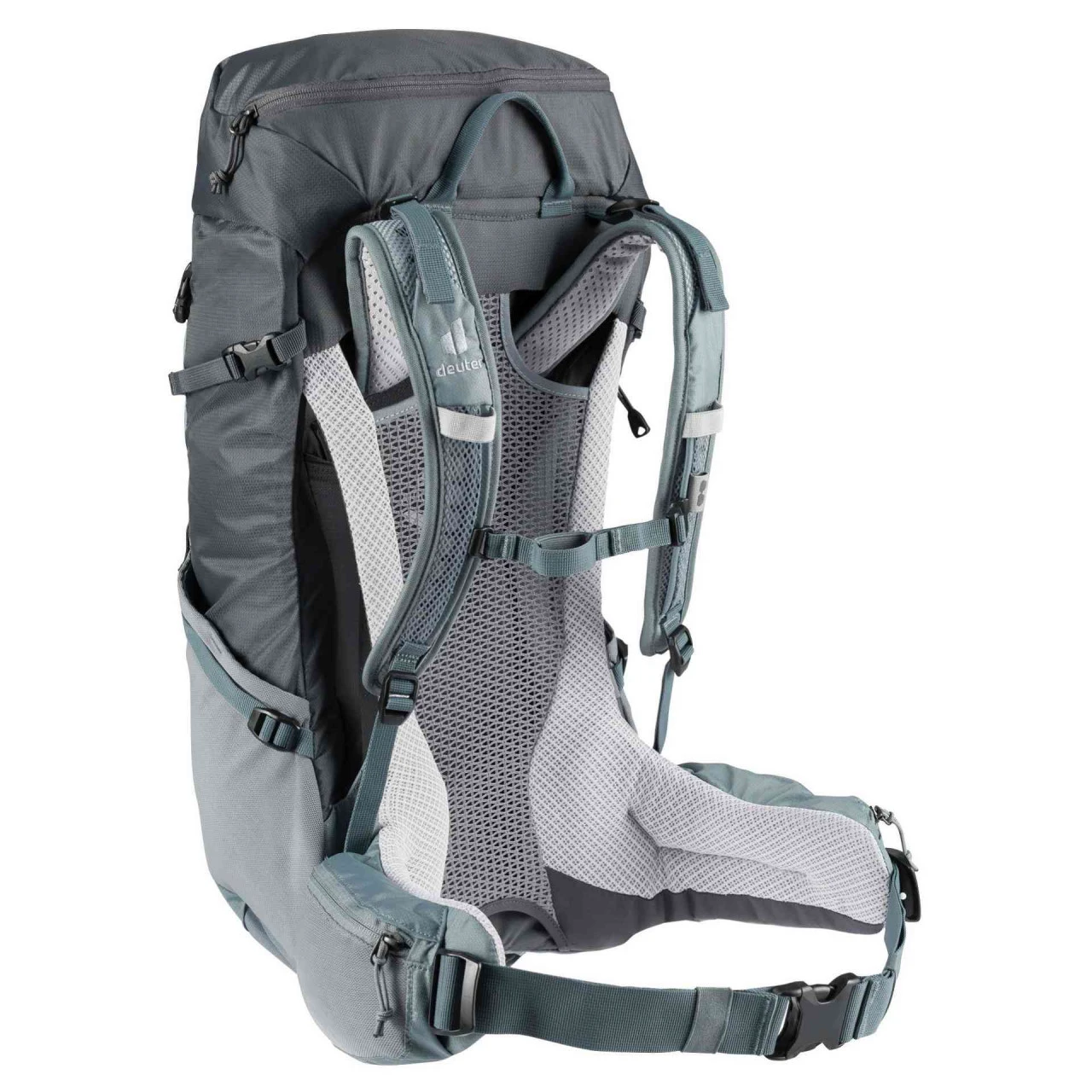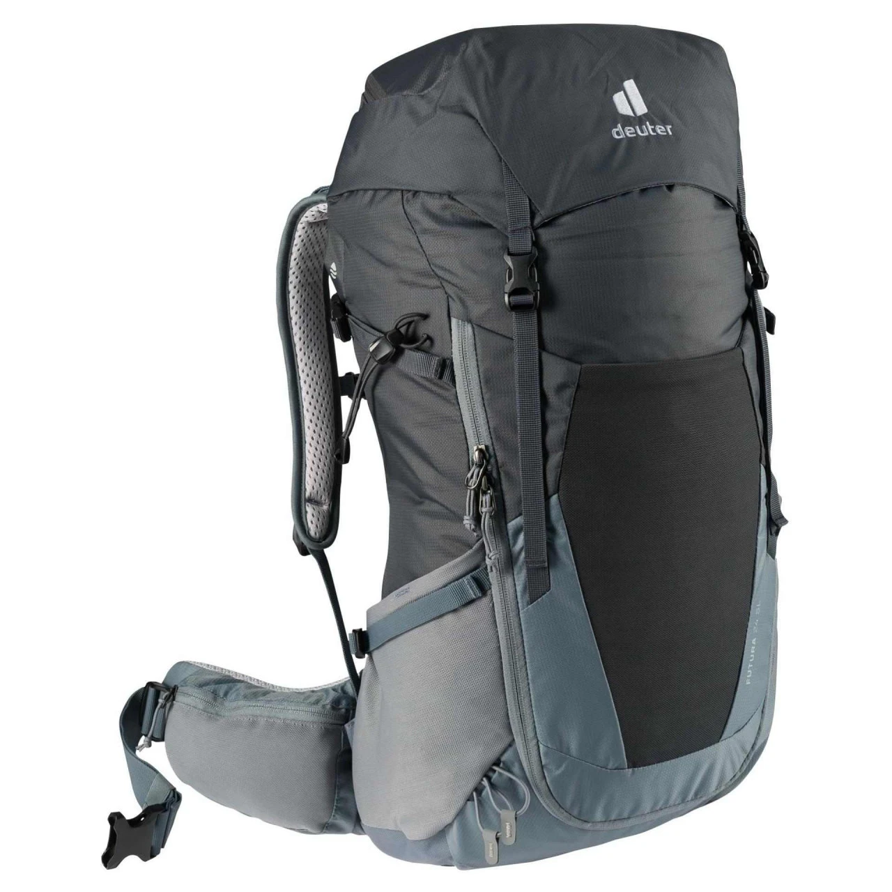 Der Deuter Futura 24 SL Damen Wanderrucksack eignet sich ideal für Tages- und Mehrtagestouren. Der Rucksack wurde besonders nachhaltig produziert und 50% seines Garns besteht aus recyceltem Rohstoff. In der Futura-Serie besteht das Hauptmaterial aus zertifiziertem Bluesign©. Der Rucksack lässt sich besonders bequem durch seine beweglichen ActiveFit Schulterträger tragen. Durch das gut belüftete Aircomfort-Rückensystem mit luftdurchlässigem Mesh schwitzt Du bei Deinen Touren deutlich weniger. Zu den weiteren Ausstattungsmerkmalen des Futura 24 SL gehören unter anderem eine Helmhalterung mit der du Deinen Helm am Rucksack befestigen kannst, eine geräumige Deckeltasche für Kleinteile und eine luftige Frontstecktasche, in der Deine nassen Anziehsachen schnell trocknen können. Des Weiteren ist Dir ein schneller und leichter Zugriff auf den Inhalt Deines Rucksacks mittels der Reißverschluss-Frontöffnung möglich. Die gepolsterten Hüftflossen mit zwei Reißverschluss-Taschen und die Pull-Forward-Verstellung am Hüftgurt bieten Dir zusätzlichen Komfort. Außerdem ist der Futura 24 SL mit einem Trinksystem kompatibel und besitzt eine abnehmbare Regenhülle.