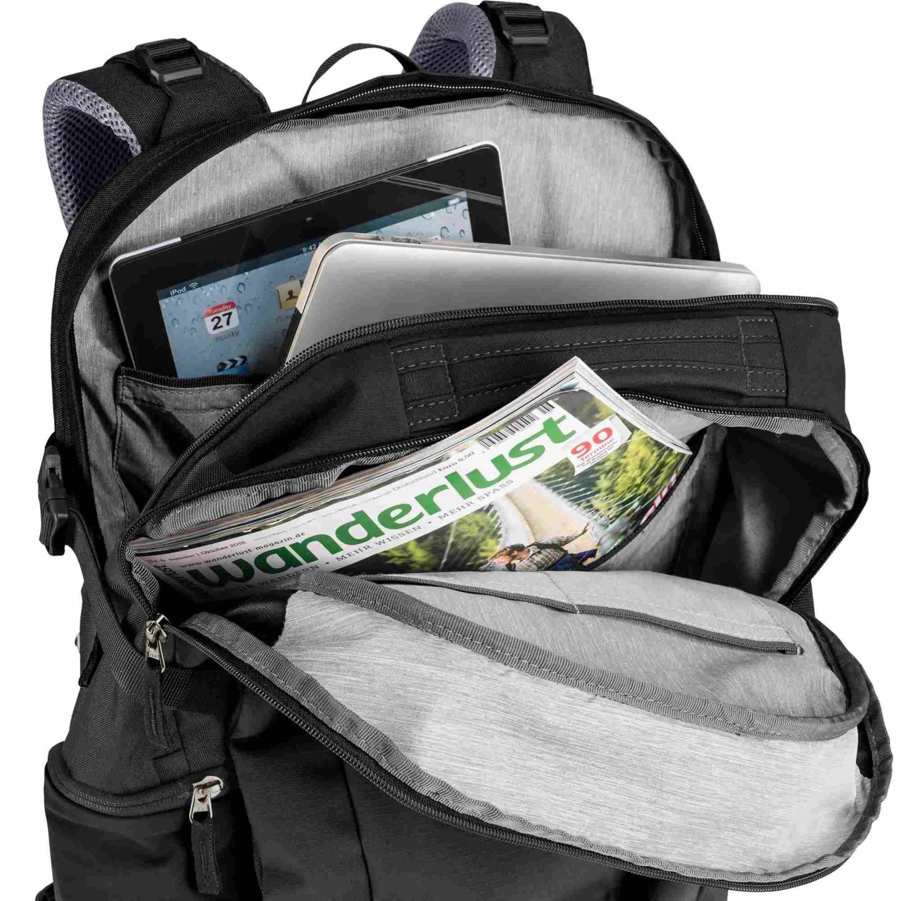 Der Deuter Gigant Tagesrucksack ist optimal für Leute geeignet, die einen bequemen, stylischen und praktischen Rucksack für den Alltag brauchen. Er verfügt über ein besonders gut organisierbares Design, welches mit einem Laptop-und Tabletfach, einem Fach für Dokumente und einem Organizerfach ausgestattet ist. Zudem besitzt der Gigant einen Schlüsselhalter, der dafür sorgt, dass Du deinen Schlüssel nicht verlierst. Trotz seinem eher urbanen Design hat der Rucksack auch einen verstellbaren Brustgurt und einen abnehmbaren Bauchgurt, wodurch ein sehr angenehmer Tragekomfort gewährleistet wird. Der Tragekomfort des Gigant wird zusätzlich durch das Airstripes-Rückensystem des Rucksacks verbessert, da Du durch die dadurch erreichte Belüftung auch an heißen und stressigen Tagen mit trockenem Rücken an der Arbeit, der Uni oder in der Schule ankommst. Die beiden Außentaschen, die sich an der Seite befinden sind perfekt geeignet um dort eine Trinkflasche zu verstauen.
