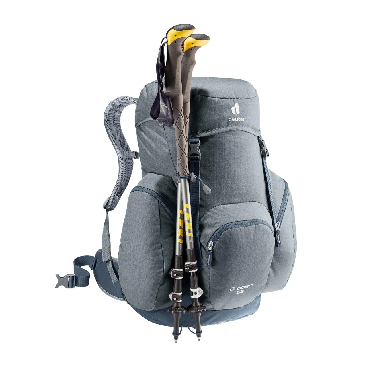 Mit modernen Funktionen erinnert der Deuter Gröden 32 Wanderrucksack im edlen Look an schöne, alte Zeiten. Das Rundprofilrahmen wurde aus dauerelastischem Federstahl hergestellt. Der stufenlos verstellbare Brustgurt und der gepolsterte Hüftgurt sorgen dafür, dass der Wanderrucksack bequem getragen werden kann. Im Stretch-Innenfach können nasse Kleidung oder eine Trinkblase verstaut werden. Ausserdem sorgt ein Innenfach dafür, dass all‘ deine Wertgegenstände sicher verwahrt sind.