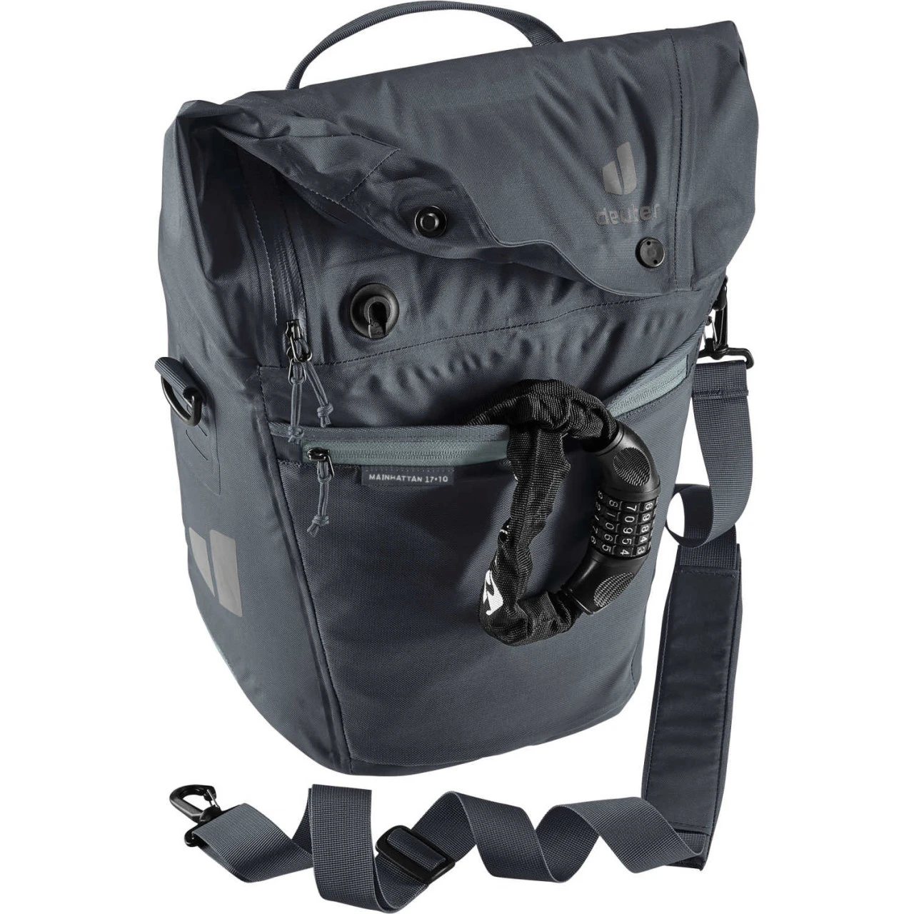 Die Deuter Mainhattan 17+10 ist eine multifunktionale Fahrradtasche für alle, die für den Weg zu Arbeit, Uni oder Schule noch einen wasserdichten Begleiter zu ihrem Outfit benötigen. Die wasserdichte Fahrradtasche bewahrt Einkäufe, Wechselklamotten und Arbeitsmaterialien sicher vor dem Eindringen der Nässe bei Regen oder Spritzwasser. Dank der großzügigen Taschenklappe mit Magnetverschlüssen lässt sich das Volumen des Organisationstalents um zusätzliche 10 Liter Stauraum erweitern. Flexibilität bietet die multifunktionale Tasche durch ihre unterschiedlichen Einsatzmöglichkeiten als reine Aufbewahrungstasche am Hinterrad oder als größere Schultertasche zum Umhängen. Und wenn’s mal schnell gehen soll, kann auch nur die einzippbare Organisationseinheit für Laptop, Tablet und Arbeitsunterlagen mitgenommen werden.