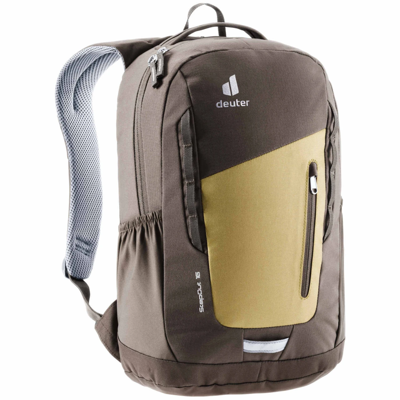 Der Deuter StepOut 16 ist ein Tagesrucksack für sportliche Städter. Der ist aber auch ideal als Reisebegleiter im Urlaub geeignet. Das Airstripes-Rückensystem sorgt für hervorragende Belüftung und die ergonomischen, gepolsterten Schulterträger für einen hohen Tragekomfort. Du gelangst über einen 2-Wege-Rundbogen-Reißverschluss bequem ins Hauptfach. Auf der Fronseite ist eine Reißverschlusstasche angebracht. Außerdem kannst du Material an den Daisy-Chains auf der Frontseite befestigen. Für Sicherheit in der Dämmerung sorgt die reflektierende Blinklicht-Halterung. An den Seiten des Step Out 16 sind zwei elastische Seitentaschen angebracht, in die du eine Trinkflasche oder einen Regenschirm stecken kannst.