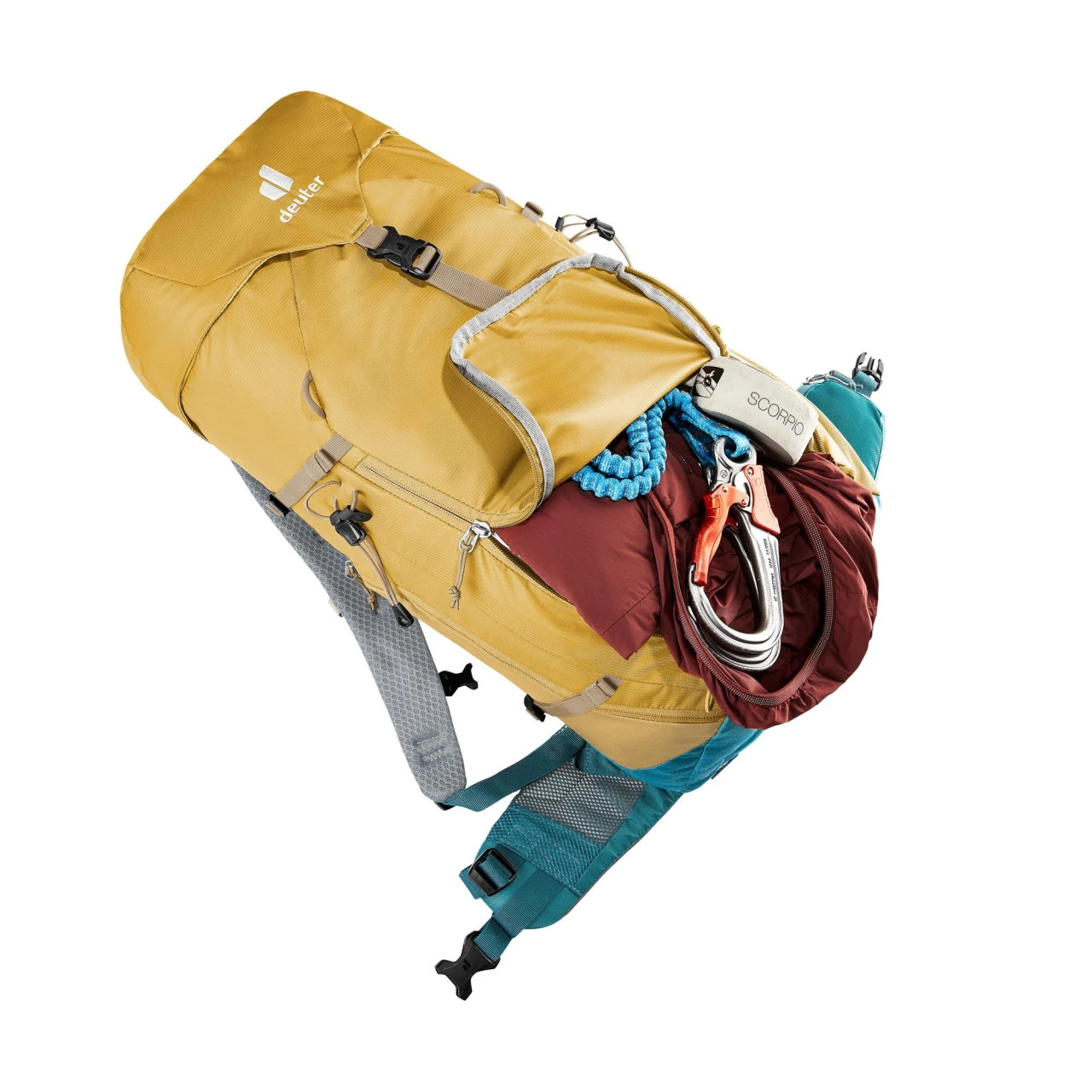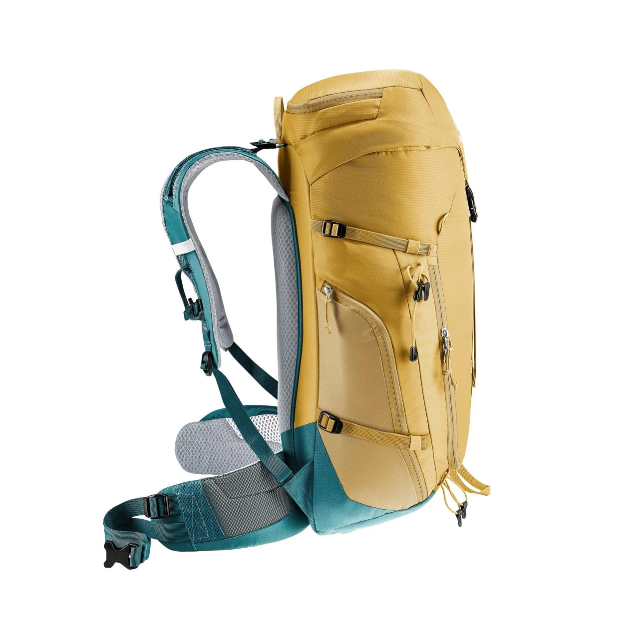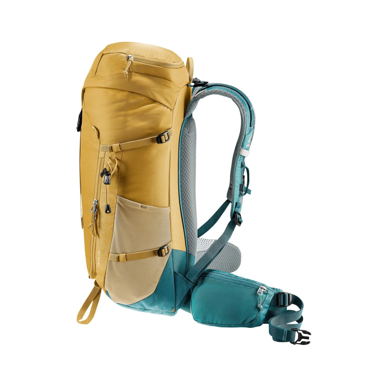 Der Deuter Trail 30 Wander- und Kletterrucksack eignet sich ideal für Wander- und Klettersteigtouren, da er nah am Körper sitzt und eine gute Belüftung durch das Aircontact-Rückensystem bietet. Durch den flexiblen Delrin© U-Rahmen verteilt sich das Gewicht des Rucksacks gleichmäßig auf Deinem Rücken. Zu den weiteren Ausstattungsmerkmalen des Trail 30 gehören unter anderem eine abnehmbare Regenhülle, ein Wertsacheninnenfach, einen stufenlos justierbaren Brustgurt, elastische Seitentaschen, ein Nasswäschefach, in dem Du deine nasse Wäsche trocknen kannst, ein schnell erreichbares Reißverschluss-Fach oben, eine elastische Fronttasche, die vielseitig nutzbar ist, eine Pickel- und Wanderstockhalterung und Karabiner-Fixierung für das Klettersteigset an den Schulterträgern. Des Weiteren besitzt der Trail 30 eine Pull-Forward-Verstellung, mit der Du den Hüftgurt mühelos festziehen und nach Deinen individuellen Bedürfnissen anpassen kannst. Außerdem ist der Rucksack mit einem Trinksystem kompatibel.