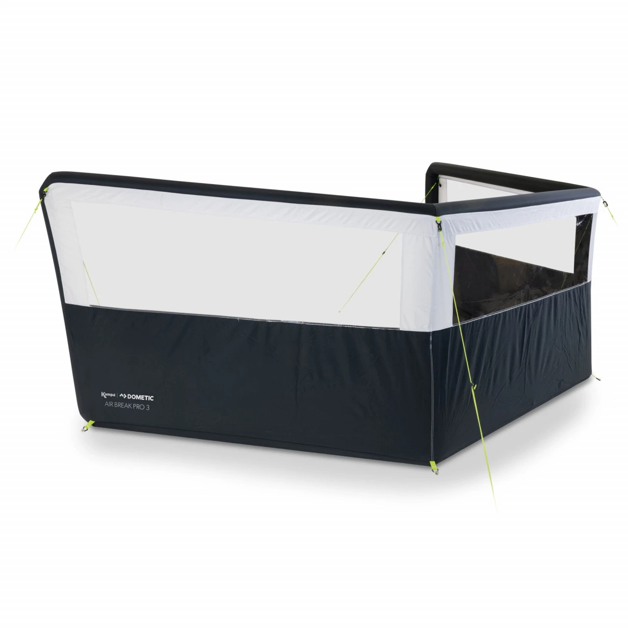 Der Dometic AIR Break Pro 3 Windschutz besteht aus dem Weathershield™ Pro Material und lässt sich ganz einfach an einem zentralen Aufblaspunkt mit Luft befüllen. Du kannst ihn ganz einfach bei Bedarf mit der Vorderseite deines Zeltes verbinden. Somit ist er ideal geeignet, um Tiere unterzubringen oder deine Kinder geschützt spielen zu lassen. Für den AIR Break Pro 3 ist eine optionale Tür erhältlich.
