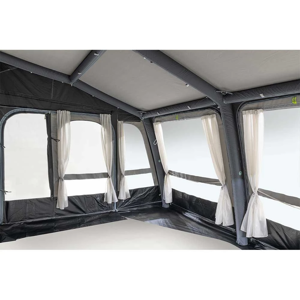 Das Dometic Grande AIR All-Season 390 M Wohnmobilvorzelt wird dich in mehreren Hinsichten begeistern. Die großzügige Tiefe von 3 m verschafft dir in dem Vorzelt ein wunderbares Raumgefühl. Hier ist viel Platz für Möbel und andere Dinge. Die Front- und Seitenwände sind herausnehmbar. Dadurch entsteht das Gefühl auf einer überdachten Terrasse zu sitzen. In den Seitentüren befinden sich Moskitonetze, die dich vor störenden Insekten schützen werden. Dank integrierten Vorhängen wird dir und deiner Familie etwas mehr Privatsphäre gesichert. So bist du vor neugierigen Blicken geschützt. Durch die Apex-Belüftung wird die Luftzirkulation in dem Dometic Grande AIR All-Season 390 M Wohnmobilvorzelt verbessert, es entsteht weniger Kondeswasser und bietet dir somit mehr Komfort. Optional erwerbbare Anbauten generieren mehr Stau – und Wohnraum. Solltest du auf unebenen Boden stehen, kannst du dein Vorzelt dank des Anschlusshöhensystems mittels eines Reißverschlusses, der oberhalb der Seitentür vernäht ist, ausgleichen.
