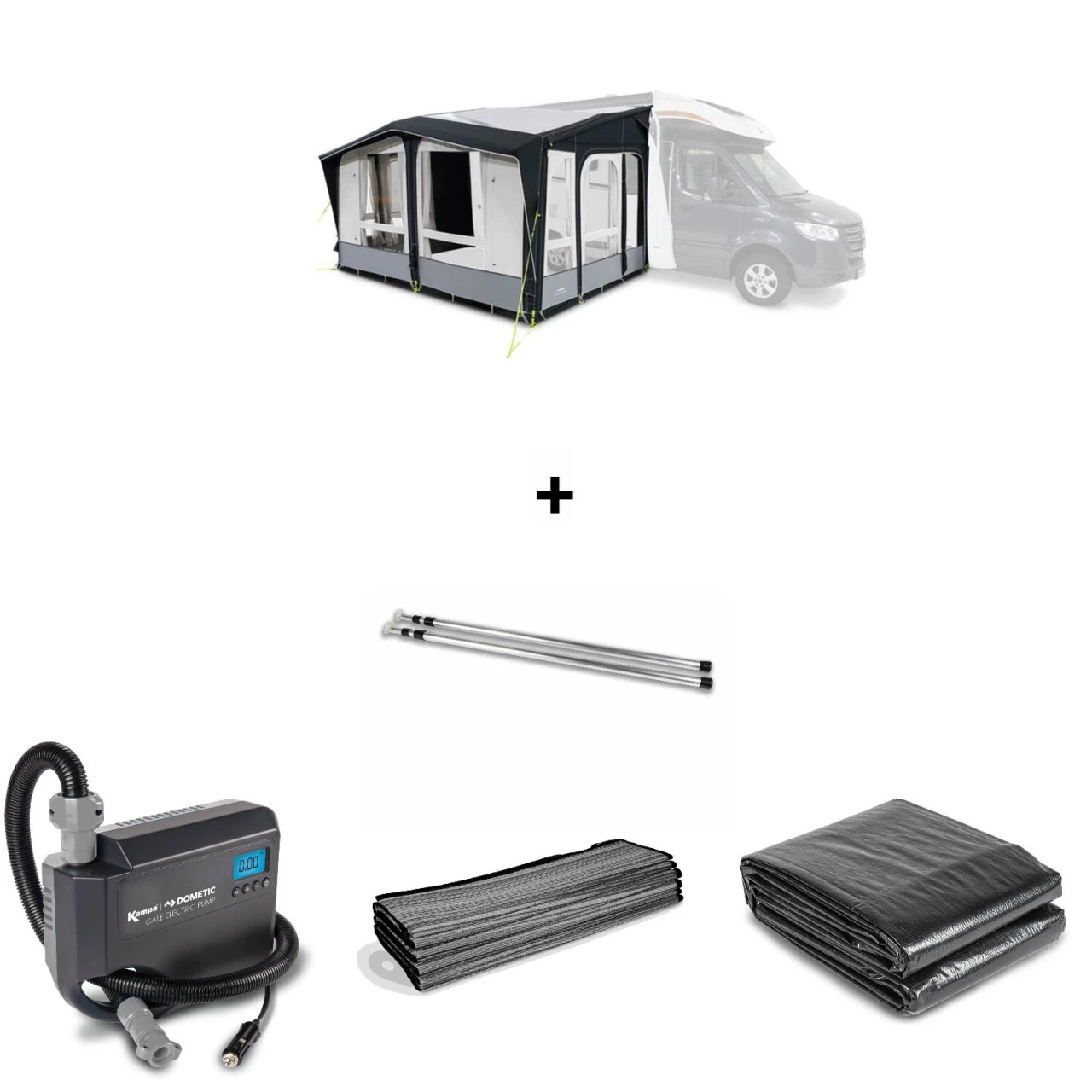 In diesem SET ist das Dometic Club AIR Pro 440 M Wohnwagenvorzelt , die passende Vorzeltunterlagen, der passende Vorzeltteppich sowie die elektrische Gale Pumpe und das Andruckstangenset enthalten.