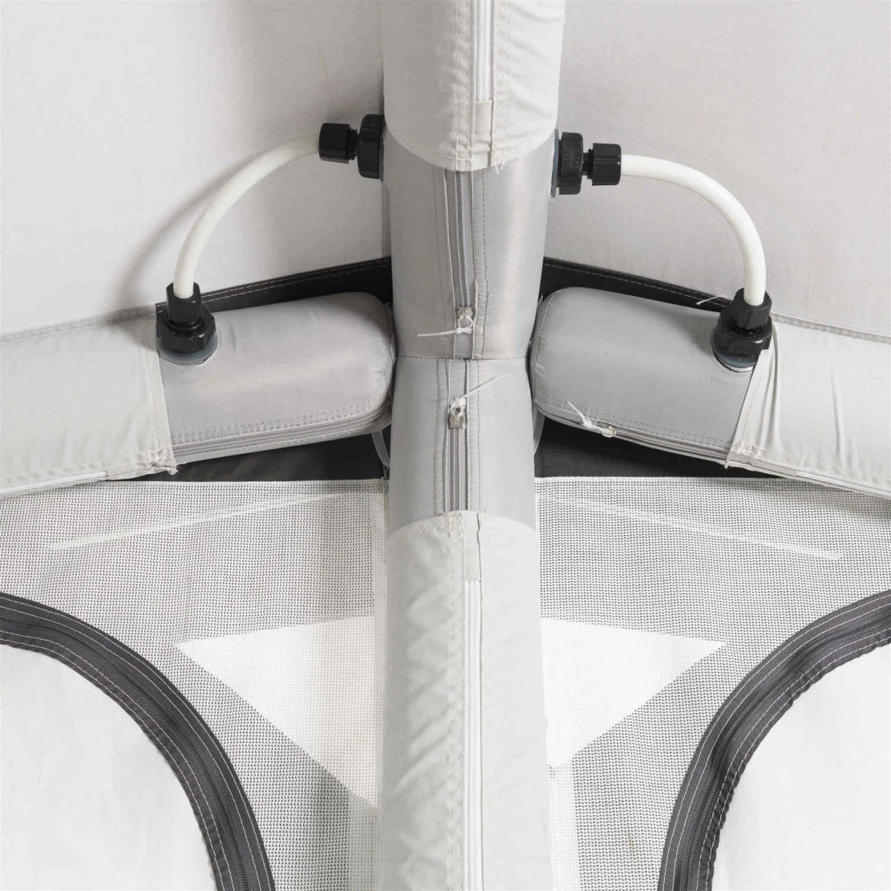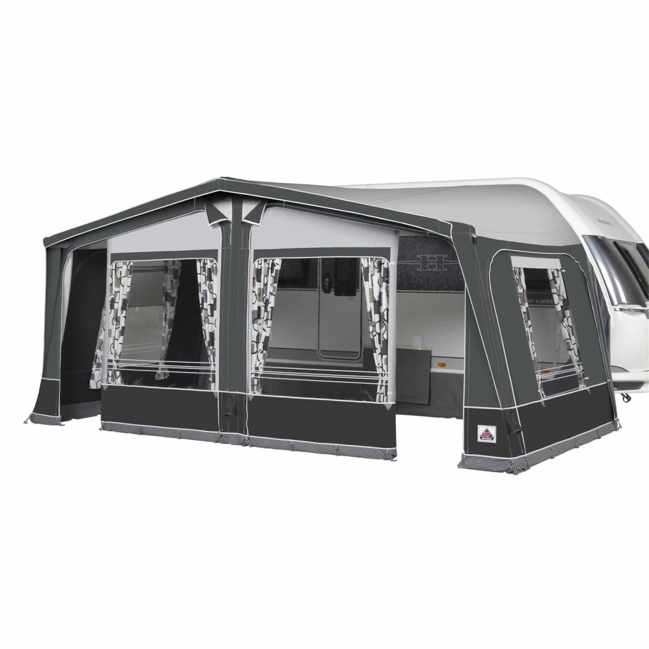 Das Doréma Maribor 240 Air All Season Größe 14 ist das erste in Serie erhältliche Luftvorzelt mit Umlaufmaß – dadurch ist eine gute Abdichtung an der Seite gewährleistet und es sind keine Andruckstangen notwendig. Du kannst es durch das EAF-System von Doréma kinderleicht aufbauen und für jede Wetterlage und Jahreszeit nutzen. Alle Vorder-, sowie Seitenwand-Segmente des Maribor 240 Air All Season sind herausnehmbar. Die Fenstes des Vorzeltes kannst Du für etwas mehr Privatsphäre mit Fensterklappen verschließen. Um eine gute Belüftung zu gewährleisten ist das Maribor 240 Air All Season mit einer permanenten Hochentlüftung, sowie einem Lüftungsfenster in einer Seitenwand ausgestattet. Das Zelt kann durch optionale Anbauten erweitert werden. Diese können rechts und/oder links am Zelt angeschlossen werden und gewährleisten zusätzlichen Stauraum. Ebenso kann das Luftvorzelt mit einem Sonnendach erweitert werden. Es verfügt dazu über einen an der Front angenähten Keder. Das Luftvorzelt Doréma Maribor AIR ist in den Größe 8 (825-850 cm) bis 19 (1.100-1.125 cm) erhältlich. Es eignet sich auch zur Verwendung an den Hubbett-Wohnwägen von Bürstner (Averso Plus, Premio Plus). Gerne beraten wir Dich hier bei der Auswahl der richtigen Größe. Das Zelt kann mit den Doréma SafeLock Abspanngurten zusätzlich abgespannt werden. Bitte beachte, dass 2 SafeLock-Set’s benötigt werden, um alle drei Abspannpunkte zu verwenden. Das Luftvorzelt ist gem. DIN EN ISO 8936 als „Typ T“ klassifiziert. Es handelt sich also um ein Reisevorzelt: geeignet für wiederholten Auf- und Abbau sowie für die Nutzung zu jeglicher Zeit des Jahres, jedoch nicht unter winterlichen Schneebedingungen.