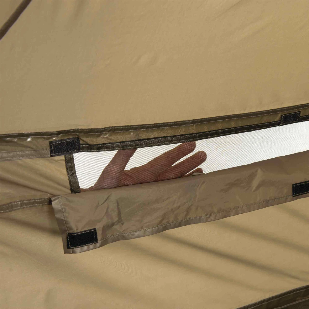 Die zweiteilige Tür hat große Mesh-Einsätze, damit das Zelt gut belüftet werden kann. Hinter den Netzeinsätzen gibt es Vorhänge mit Reißverschluss. So lassen sie sich nach Bedarf stufenlos schließen. Es gibt drei Belüftungsöffnungen an den Seiten im unteren Zeltbereich und eine gute, regensicher Belüftung im Dach.