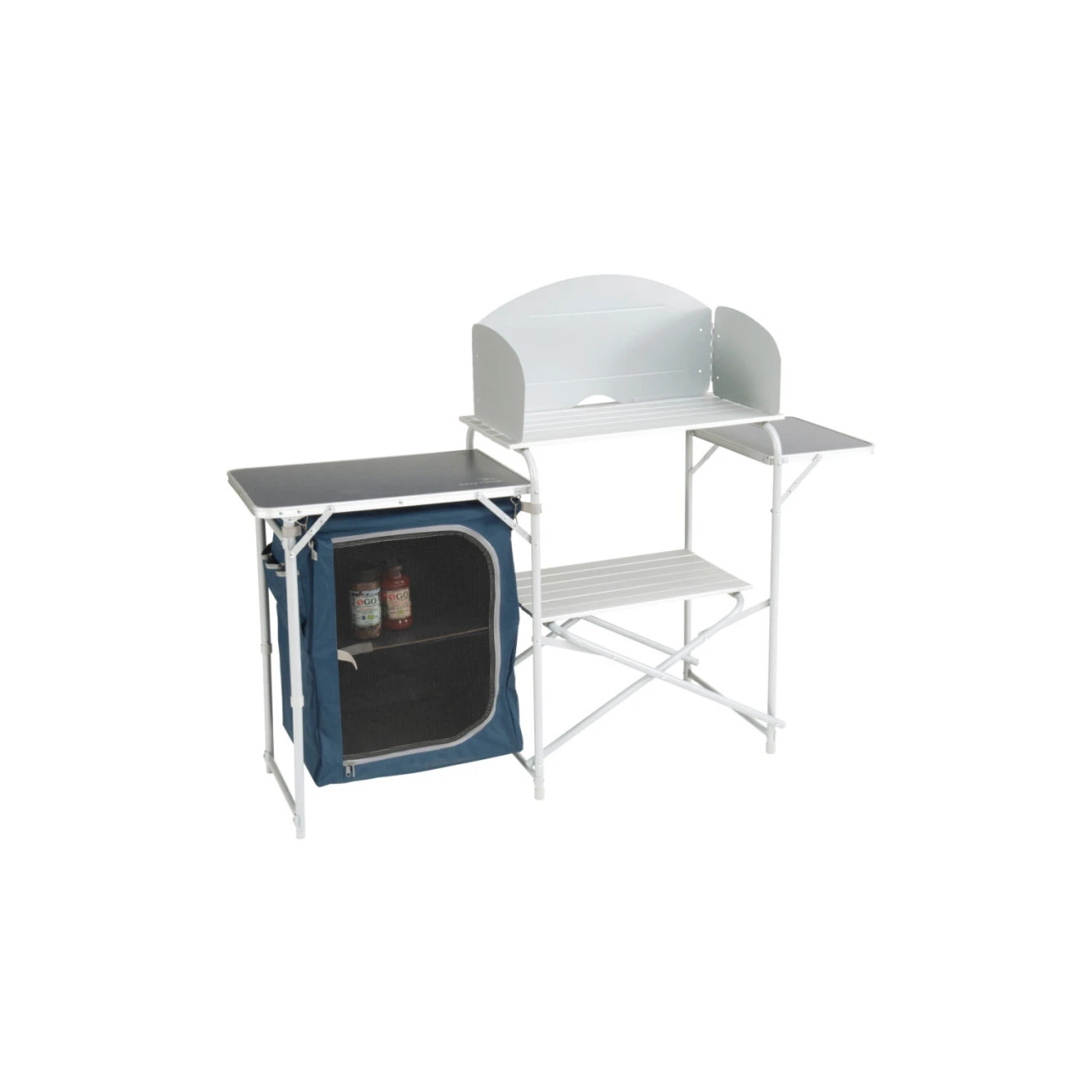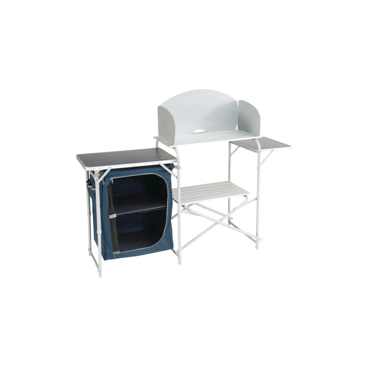 Der Easy Camp Sarin ist ein praktischer Campingtisch, der sich hervorragend zur Essenszubereitung eignet. Auf dem Haupttisch mit Windschutz und den beiden Seitentischen findet sich genug Platz, um eine leckere Mahlzeit zu zaubern. Das integrierte Regal bietet sich als Ablage an, um wichtige Gegenstände schnell in greifbarer Nähe zu haben. Der Easy Camp Sarin hat einen Stahlrahmen und wiegt 9,4 kg. Zum einfachen Transport kann man den Tisch einfach in eine Tragetasche packen.
