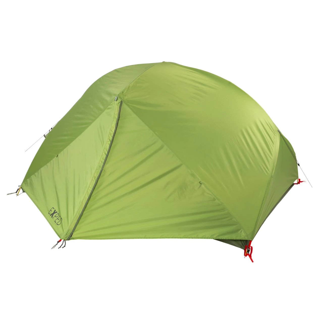 Das Exped Lyra III ist ein leichtes, freistehendes Zelt für bis zu 3 Personen. Der Aufbau geht schnell und einfach von statten. Das Innenzelt wird mit Clips am DAC-Aluminium-Gestänge befestigt. Da das Innenzelt zu großen Teilen aus feinstem Moskitonetz besteht, kann es in trockenen, heißen Sommernächten auch ohne das Außenzelt benutzt werden, ohne das Mücken stören. Um trotzdem etwas Schutz und Privatsphäre zu haben, gibt es einen Wind- und Sichtschutzrand am Innenzelt. Wenn das Außenzelt angebracht ist, entsteht für jeden der 2 Eingänge eine Apside. Der Clou beim Lyra III ist das einseitig aufrollbare Außenzelt. Es kann von einer Seite aufgerollt werden und sorgt für die beste Belüftung in der Nacht.