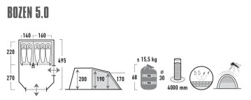 Das High Peak Bozen 5.0 Familienzelt im Tunneldesign gehalten, bietet 5 Personen Platz und überzeugt mit vielen praktischen Features. In das Innere des Zeltes gelangst Du durch die Front- oder Seitentür. Beide Eingänge sind mit Mesh ausgestattet, sodass keine Insekten in Dein Zelt gelangen können. Im Inneren Deines Zeltes hast Du einen großen Wohnraum, der Dir viel Platz zum Kochen, Spielen und Entspannen bietet. Durch die Klarsichtfolienfenster kommt viel Licht in Dein Zelt. Möchtest Du hingegen mehr Privatsphäre genießen, kannst Du die Gardinen vorziehen. Außerdem verfügt das Bozen 5.0 über zwei abgedunkelte Schlafkabinen. Die beiden Schlafkabinen sind mit einer Reißverschluss-Trennwand voneinander getrennt. Möchtest Du einen großen Schlafraum haben, kannst Du die Trennwand herauszippen. Für einen besseren Schlafkomfort sind die Schlafkabinen mit zwei Vario Vent Control Eingängen mit Meshfenstern ausgestattet. Die Meshfenster können bei Bedarf geschlossen werden. Im Innenzelt befinden sich an den Seitenwänden Innentaschen. Dort kannst Du Zeitschriften oder Ähnliches verstauen. Zu den weiteren Ausstattungsmerkmalen des Bozen 5.0 gehören eine Lampenhalterung, eine Dauerventilation, verstellbare Spanngurtbänder, ein rolldown Packsack mit Kompressionsgurten und eine Positionsmarkierung, die das Einhängen des Außenzeltes erleichtert.