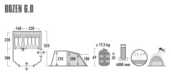 Das High Peak Bozen 6.0 Familienzelt im Tunneldesign gehalten, bietet 6 Personen Platz und überzeugt mit vielen praktischen Features. In das Innere des Zeltes gelangst Du durch die Front- oder Seitentür. Beide Eingänge sind mit Mesh ausgestattet, sodass keine Insekten in Dein Zelt gelangen können. Im Inneren Deines Zeltes hast Du einen großen Wohnraum, der Dir viel Platz zum Kochen, Spielen und Entspannen bietet. Durch die Klarsichtfolienfenster kommt viel Licht in Dein Zelt. Möchtest Du hingegen mehr Privatsphäre genießen, kannst Du die Gardinen vorziehen. Außerdem verfügt das Bozen 6.0 über zwei abgedunkelte Schlafkabinen. Die beiden Schlafkabinen sind mit einer Reißverschluss-Trennwand voneinander getrennt. Möchtest Du einen großen Schlafraum haben, kannst Du die Trennwand herauszippen. Für einen besseren Schlafkomfort sind die Schlafkabinen mit zwei Vario Vent Control Eingängen mit Meshfenstern ausgestattet. Die Meshfenster können bei Bedarf geschlossen werden. Im Innenzelt befinden sich an den Seitenwänden Innentaschen. Dort kannst Du Zeitschriften oder Ähnliches verstauen. Zu den weiteren Ausstattungsmerkmalen des Bozen 6.0 gehören eine Lampenhalterung, eine Dauerventilation, verstellbare Spanngurtbänder, ein rolldown Packsack mit Kompressionsgurten und eine Positionsmarkierung, die das Einhängen des Außenzeltes erleichtert.