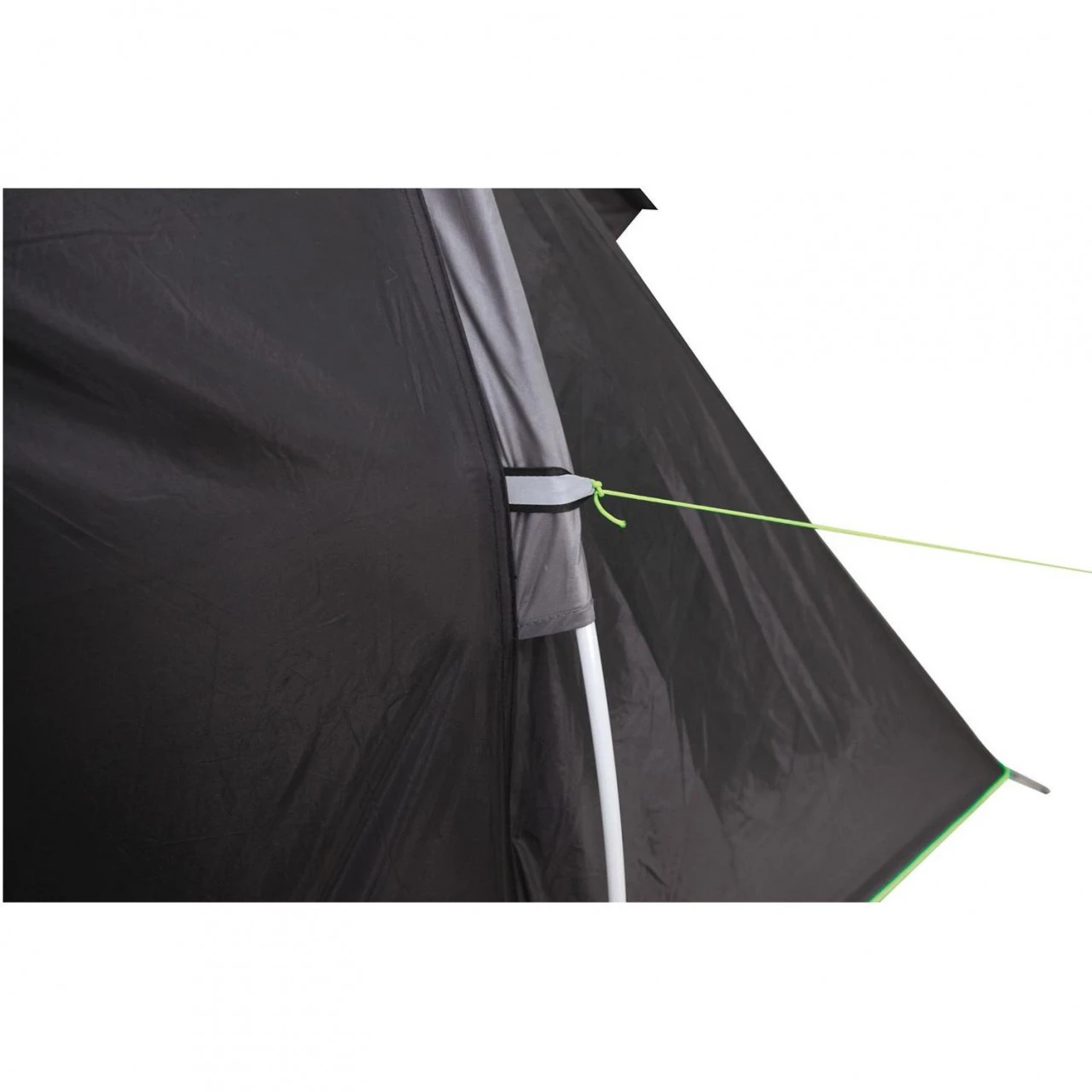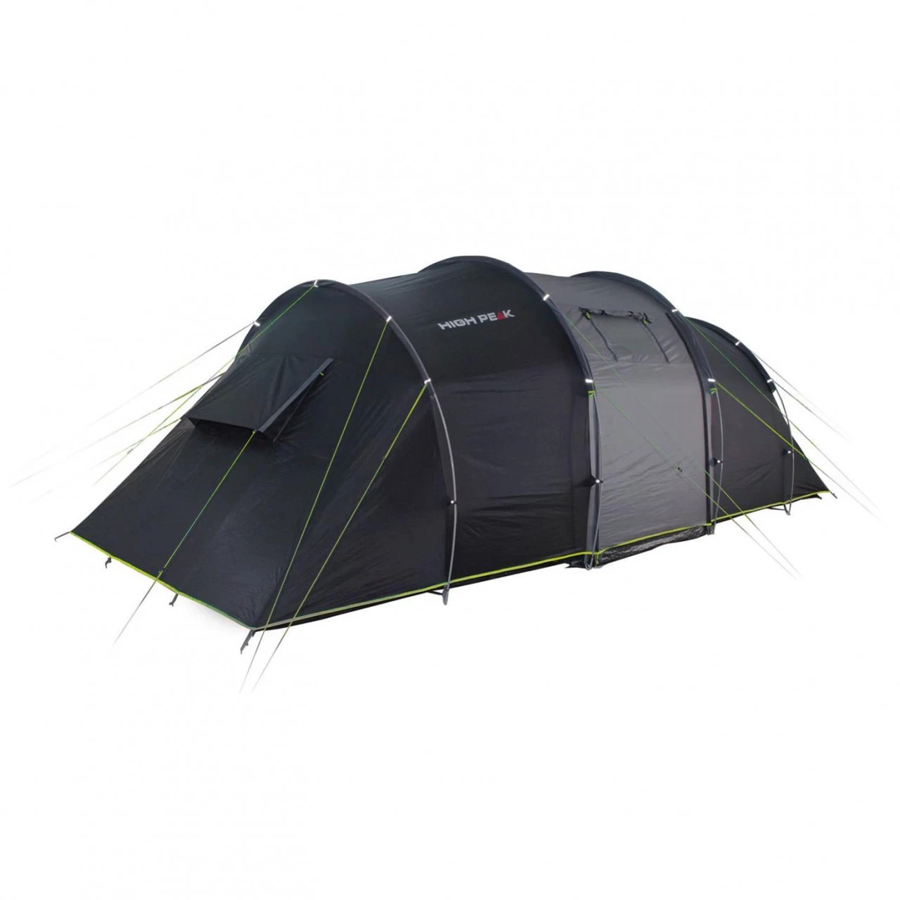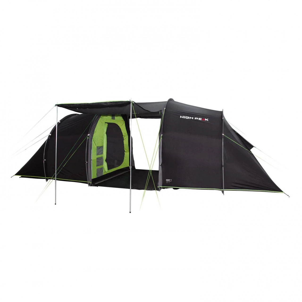 Das High Peak Tauris 6 Familienzelt im Tunnelzeltdesign überzeugt mit vielen praktischen Features. In den zwei gegenüberliegenden Schlafkabinen ist genügend Platz für bis zu sechs Personen und der Wohnbereich bietet viel Raum zum Kochen, Spielen und Entspannen. Um den Wohnraum noch zu erweitern, haben Sie tagsüber die Möglichkeit eines der Innenzelte zu entfernen. Gerade bei regnerischem Wetter ist dies eine hervorragende Eigenschaft. Generell brauchen Sie sich mit dem High Peak Tauris 6 kaum sorgen um Regen zu machen: Das Zelt ist mit einer Wassersäule von 4000 mm absolut wasserdicht und die Reißverschlussabdeckungen sind mit einer zusätzlichen Regenrinne ausgestattet. Da beim Aufbau das Außenzelt zuerst aufgestellt wird, bleiben auch die Innenzelte trocken. Die gegenüberliegende High Peak Vario Ventilation sorgt immer für frische Luft und ist ebenfalls wetterfest. Die Belüftungsöffnungen sollten zur Verhinderung von Kondensationsnässe im Zelt durchgehend geöffnet bleiben. Wenn Sie einmal mehr lüften möchten, dann öffnen Sie einfach die Eingänge – durch deren integrierte Moskitonetze bleiben Sie dabei sogar vor nervigen Insekten im Zelt verschont. Bei strahlendem Sonnenschein spendet der als Sonnendach verwendbare Eingang Schatten. Das High Peak Tauris 6 Familienzelt ist mit acht Organizertaschen für kleine Gegenstände, vier Zelttaschen und einer Lampenhalterung ausgestattet.