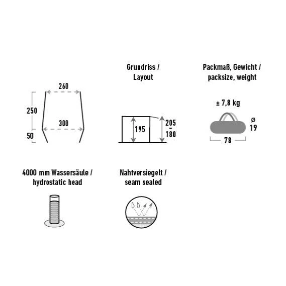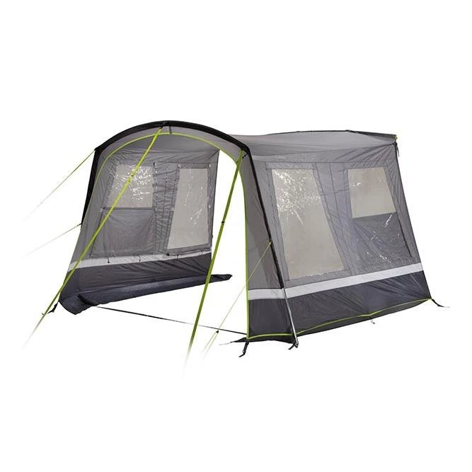 Das High Peak Trento 2.0 ist ein Busvorzelt, was seitlich am Fahrzeug befestigt wird und Schutz vor Sonne, Regen und Wind bietet. Das Stahlrohrgestänge und die drei verstellbaren Sturmbänder verleihen dem Zelt eine hohe Stabilität im Wind. Die gelben Abspannleinen und Sturmbänder sind in der Dämmerung sehr gut sichtbar und verhindern, dass jemand darüber stolpert.