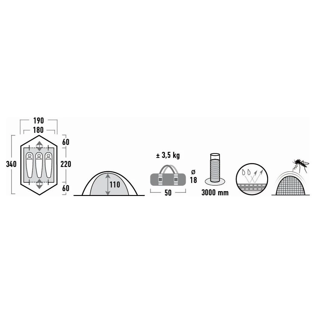 Das ideal für aktive Camper geeignete High Peak Woodpecker 3 Campingzelt ist dank des außenliegenden Gestänges schnell und unkompliziert aufgebaut und ist durch das niedrige Gewicht von ca. 3,5 kg perfekt zum Mitnehmen auf Wandertouren. In einem großen Schlafraum ist genügend Platz für bis zu drei Personen. Über das Dachgestänge entstehen zwei praktische Apsiden für den regensicheren Zutritt ins Zelt und zum Verstauen der Ausrüstung. Durch zwei wetterfeste Dauerbelüftungsöffnungen am Dach ist immer für frische Luft gesorgt. Auch der Aufbau bei Regen erweist sich als unkompliziert. Denn das Außenzelt des Woodpecker 3 wird zuerst errichtet, wodurch die anschließend eingehängten Innenzelte trocken bleiben. Das Innenzelt ist mit zwei Eingängen mit Gazetüren versehen, die bei warmem Wetter die Belüftungsmöglichkeiten erweitern und nervigen Mücken das Eindringen verwehren. Weitere Ausstattungsmerkmale des High Peak Woodpecker 3 Campingzeltes sind Innentaschen und ein praktischer Lampenhalter.