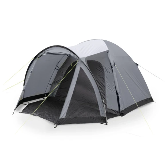 Das Kampa Brighton 5 Familienzelt bietet durch seine Kuppelform eine sehr gute Windstabilität und dadurch auch eine Stehhöhe von 195 cm. Das Weathershield 63D ist wasserdicht und sehr robust, dadurch kommt das gesamte Zelt auf ein Gewicht von nur 8,2 kg. In den Vorraum des Brighton 5 kann ein separater Boden, der im Lieferumfang enthalten ist, eingesetzt werden, so muss man nicht auf dem steinigen oder nassen Untergrund sitzen. Das Fiberglasgestänge lässt sich schnell und einfach in die dafür vorgesehenen Ösen schieben und ist sehr flexibel. Im Ganzen ein guter Allrounder im Preis-/Leistungsverhältnis.