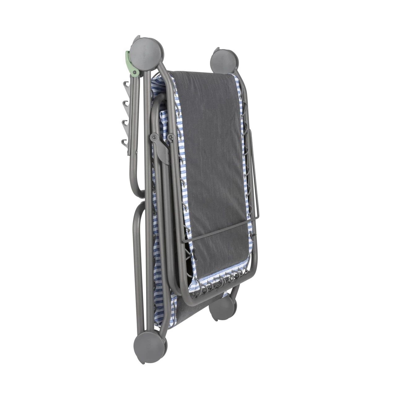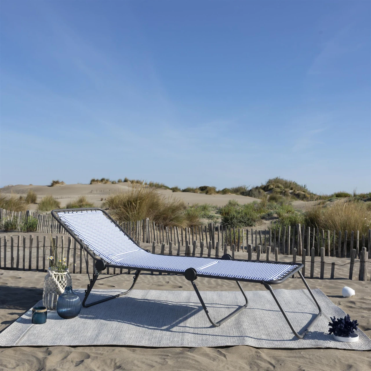 Die Lafuma SIESTA L Polycotton Sonnenliege lässt sich auch als Zusatzbett verwenden. Das Kopfteil der dreifüßigen Liege lässt sich in vier verschiedene Positionen verstellen. Die Rückenlehne mit Sicherheitsleiste schützt vor Stürzen und verhindert, dass Du dir die Finger einklemmst. Die maximale Belastbarkeit liegt bei 140 Kilogramm. Der Rahmen der klappbaren Liege ist aus Stahl und hat einen Durchmesser von 20 mm.