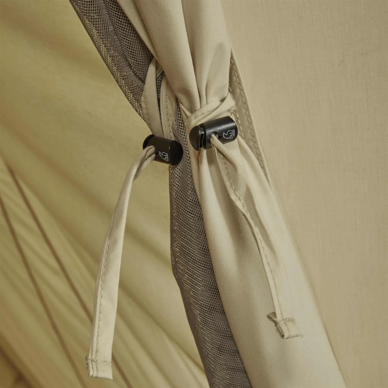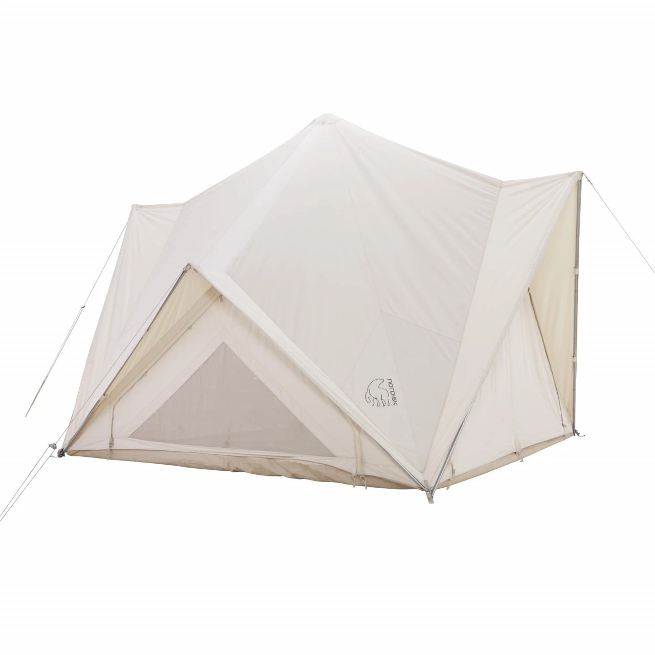 Das Nordisk Midgard 9.2 Familienzelt ist ein stangenfreies Baumwoll-Mischgewebe Zelt, welches in einem innovativen Design gehalten ist. Es lässt sich schnell und leicht aufbauen. Im Zelt selbst finden bis zu 6 Personen problemlos Platz und der geräumige Wohnbereich dient gleichzeitig als Schlafbereich. In das Innere des Zeltes gelangst Du durch einen der beiden Eingänge. Im Inneren des Midgard 9.2 hast Du durch die 2,70 Meter Zelthöhe eine zentrale Stehöhe. Durch die Fenster und Türen kommt besonders viel Licht und Luft in das Zelt. Dies sorgt für ein helles und belüftetes Zeltklima. Darüber hinaus sind die Fenster und Türen mit Moskitonetzen ausgestattet, sodass keine Insekten hineinkommen können. Zu den weiteren Ausstattungsmerkmalen des Midgard 9.2 gehören unter anderem ein großes Vordach über dem Eingang, welches einen sicheren Zugang ins Innere gewährt, aber auch vor Witterungseinflüssen schützt und eine stangenfreie Optik, da es keine störende Mittelstange gibt. Außerdem lässt sich das Midgard 9.2 mit der Vimur-Serie in der Größe und Fläche erweitern.