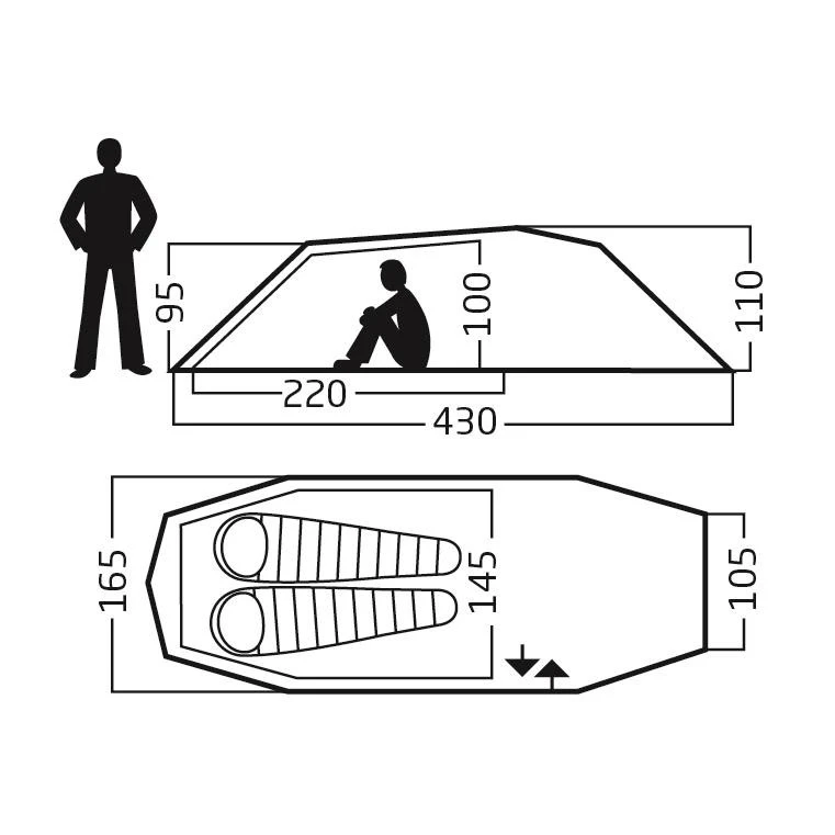 Der Vordereingang verfügt über viele Öffnungsmöglichkeiten. Das Innenzelt hat einen O-förmigen Türeingang mit Aufbewahrungstasche. Das Gestänge aus ultraleichtem Aluminium hält Windstärken bis 35 m/sec (126 km/H) zuverlässig stand. Durch das geringe Packmaß eignet sich das Zwei-Personen-Zelt gut für Wander-, Kajak- und Radtouren.