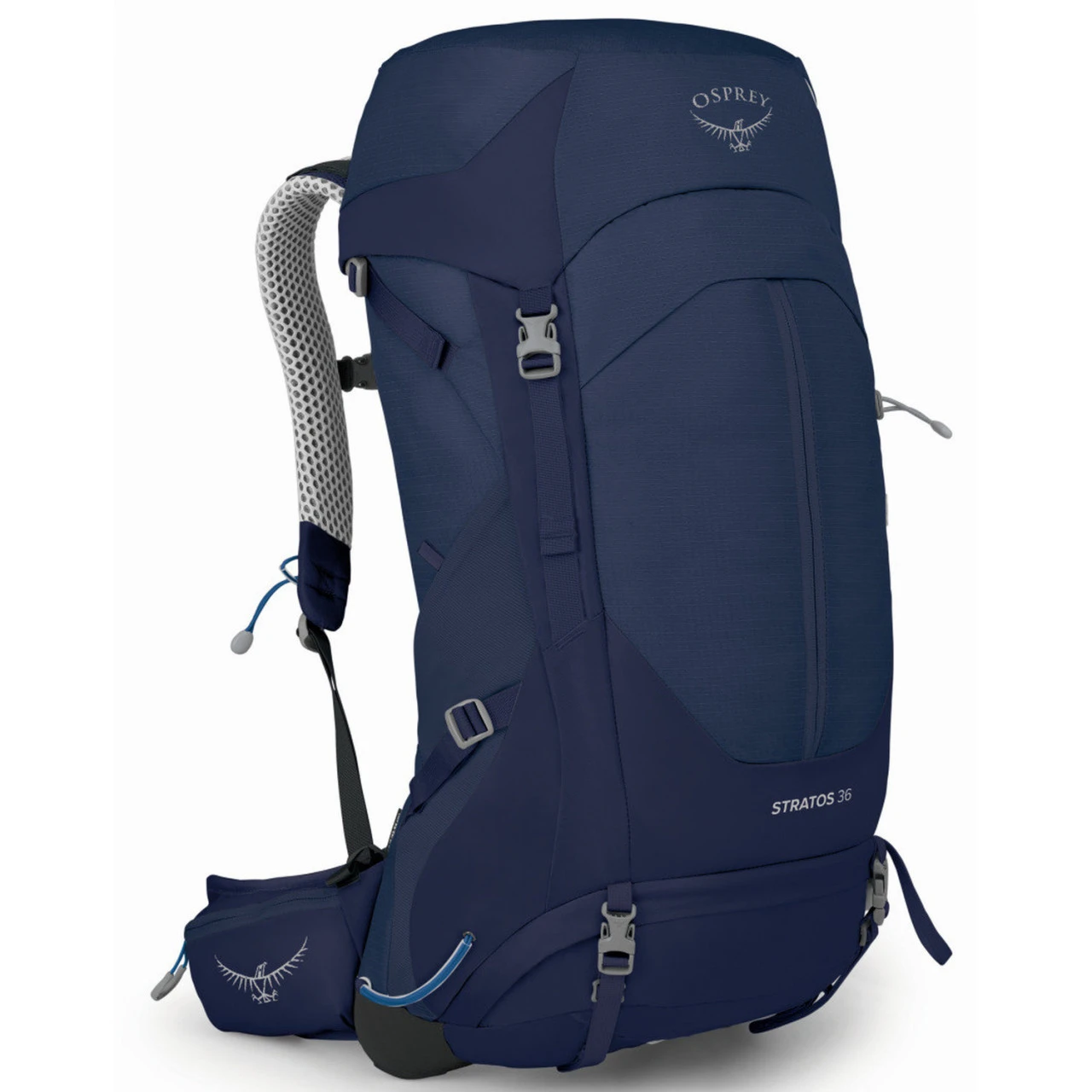 Der Stratos 36 von Osprey ist ein hervorragender Wanderrucksack, der mit allen wichtigen Komfortmerkmalen ausgestattet ist. Das weiche Netzgewebe des Airspeed-Netzrückens wurde nahtlos bis in den Hüftgurt gezogen, so dass keine lästigen Nähte reiben oder drücken können. Das Rückensystem ist stufenlos verstellbar, so dass er immer perfekt sitzt. Wenn der Stratos 36 gepackt ist, hast du mehrere Möglichkeiten an deine Sachen im Hauptfach zu kommen. Wenn sie oben liegen, öffnest du den Deckel, sind sie eher in der Mitte, dann hast du einen Zugriff über einen Reißverschluss an der Seite. Der Seitenzugriff hat den Vorteil, dass du deinen Rucksack nicht mit dem Rücken auf den Boden legen musst und so dein T-Shirt oder deine Jacke nicht schmutzig werden. Du kannst auch über den Reißverschluss am Schlafsackfach zugreifen. Damit du den Stratos nicht absetzen musst, wenn du deine Trekkingstöcke verstauen willst, hat er das Stow-on-the-Go™ Befestigungssystem. Das ist eine zusätzliche Stockhalterung direkt am Träger. Außerdem ist auf jeder Seite des Hüftgurtes eine Reißverschlusstasche aufgesetzt, so dass du Kompass, Handy oder Energieriegel immer sofort zur Hand hast. Da es sich auf längeren Touren empfiehlt, viel zu trinken, gibt es ein Trinkblasenfach. Du kannst aber auch eine Trinkflasche oder einen Regenschirm in den Netztaschen an der Seite verstauen. Mit der integrierten, abnehmbaren Regenhülle bleiben deine Sachen trocken, auch wenn sich das Wetter dreht.