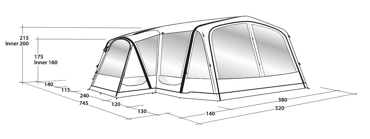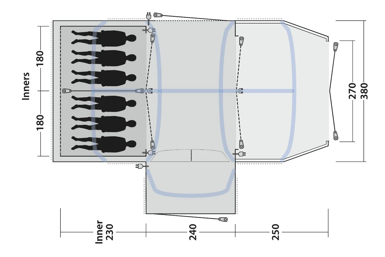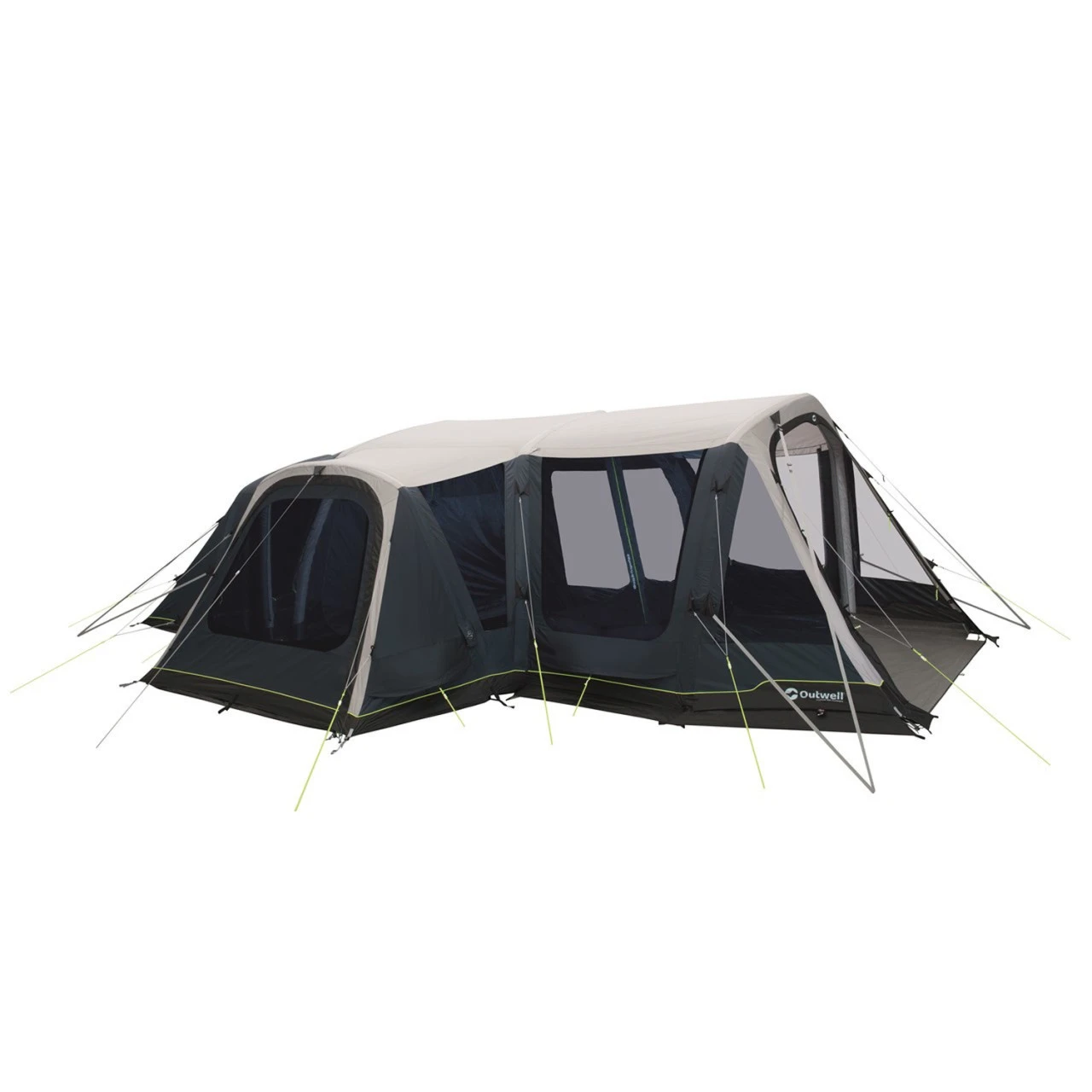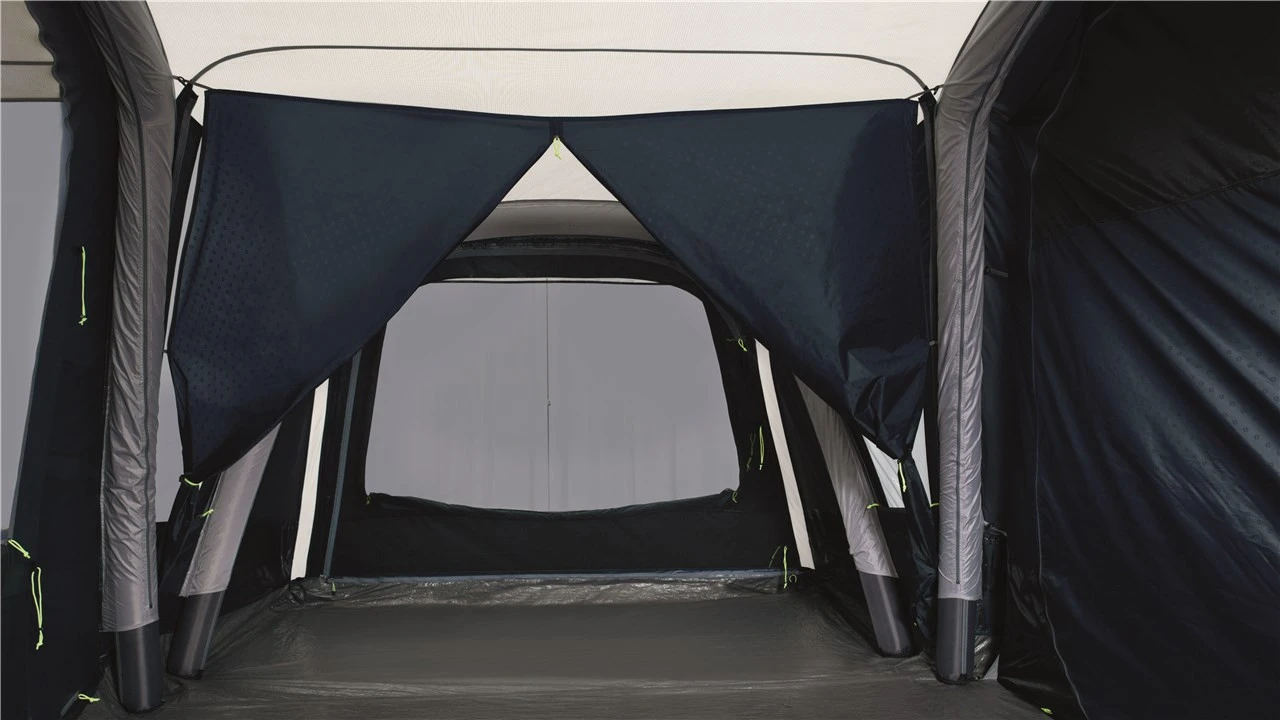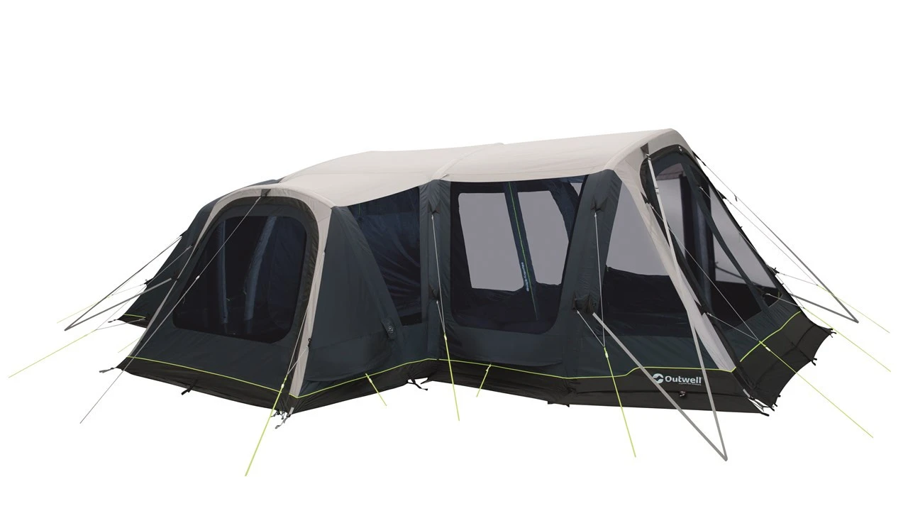 Das Outwell Airville 6SA Familienzelt ist ein wahres Multitalent und eignet sich ideal für Dein Campingerlebnis mit bis zu sechs Personen. Es gliedert sich in einen Nassbereich, einen großen Wohnraum und drei Schlafkabinen. Außerdem wurde das Zelt mit der Wing-Lounge ausgestattet und bietet Dir somit zusätzlichen Platz für Deine Kinder zum Spielen oder zum Relaxen auf Deinem Luftsofa. Das Power-Air-Luftsystem, welches außerhalb am Zelt vorzufinden ist, sorgt dafür, dass das Zelt innerhalb weniger Minuten stabil steht. Luftschläuche im gotischen Stil bieten viel Kopffreiheit und Platz im Inneren des Zeltes. Die große Fronttür kann variabel geöffnet werden und wurde mit einem Moskitonetz ausgestattet, sodass Du abends vor lästigen Insekten geschützt bist. Außerdem ist die Fronttür mit einem Quick and Quiet Magnetverschluss ausgestattet, mit dem Du die Tür geräuschlos öffnen und auch wieder schließen kannst. Neben der Fronttür gibt es auch zwei Seiteneingänge, die mit einem Moskitonetz ausgestattet sind. Somit kannst Du auch diese Türen offenlassen und Dein Zelt lüften, ohne das Insekten hineingelangen. Die großen, getönten Fenster sorgen für einen hervorragenden Ausblick auf Deine Umgebung. Solltest Du etwas mehr Privatsphäre benötigen, kannst Du die Gardinen einfach verschließen. Das HookTrack-System, kleine Haken, die sich in der Decke befinden, erleichtert Dir das Aufhängen von Beleuchtung oder anderen Gegenständen (bis 1,5 kg) an beliebigen Positionen. In den Schlafkabinen wurde abgedunkeltes Material verwendet, welches Deine Nächte ruhiger und länger gestalten soll. Die Abtrennungen können per Reißverschluss entfernt werden, sodass eine große Schlafkabine entsteht. Seitliche Türen sorgen bei Deinem Airville 6SA für eine optimale Unterstützung des Belüftungssystems und einen flexiblen Zugang zum Zelt. Netztaschen im Innenzelt bewahren kleine Gegenstände sicher und immer griffbereit auf. Für ein angenehmes Zeltklima und mehr Komfort sorgt das hintere Belüftungssystem.