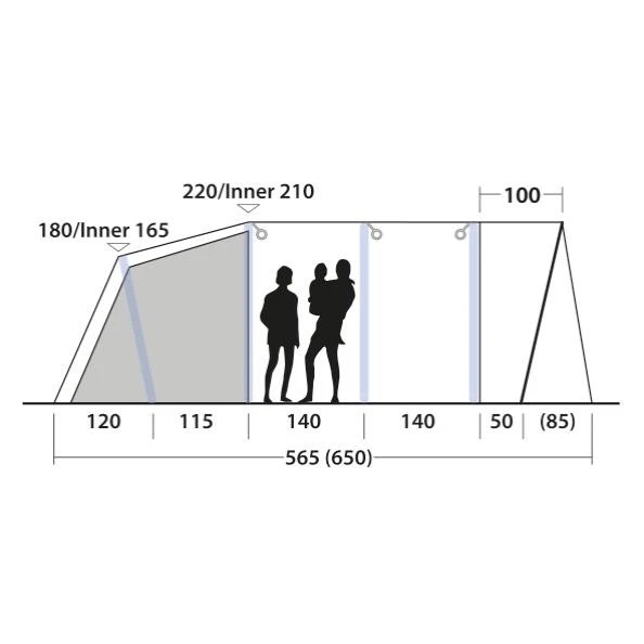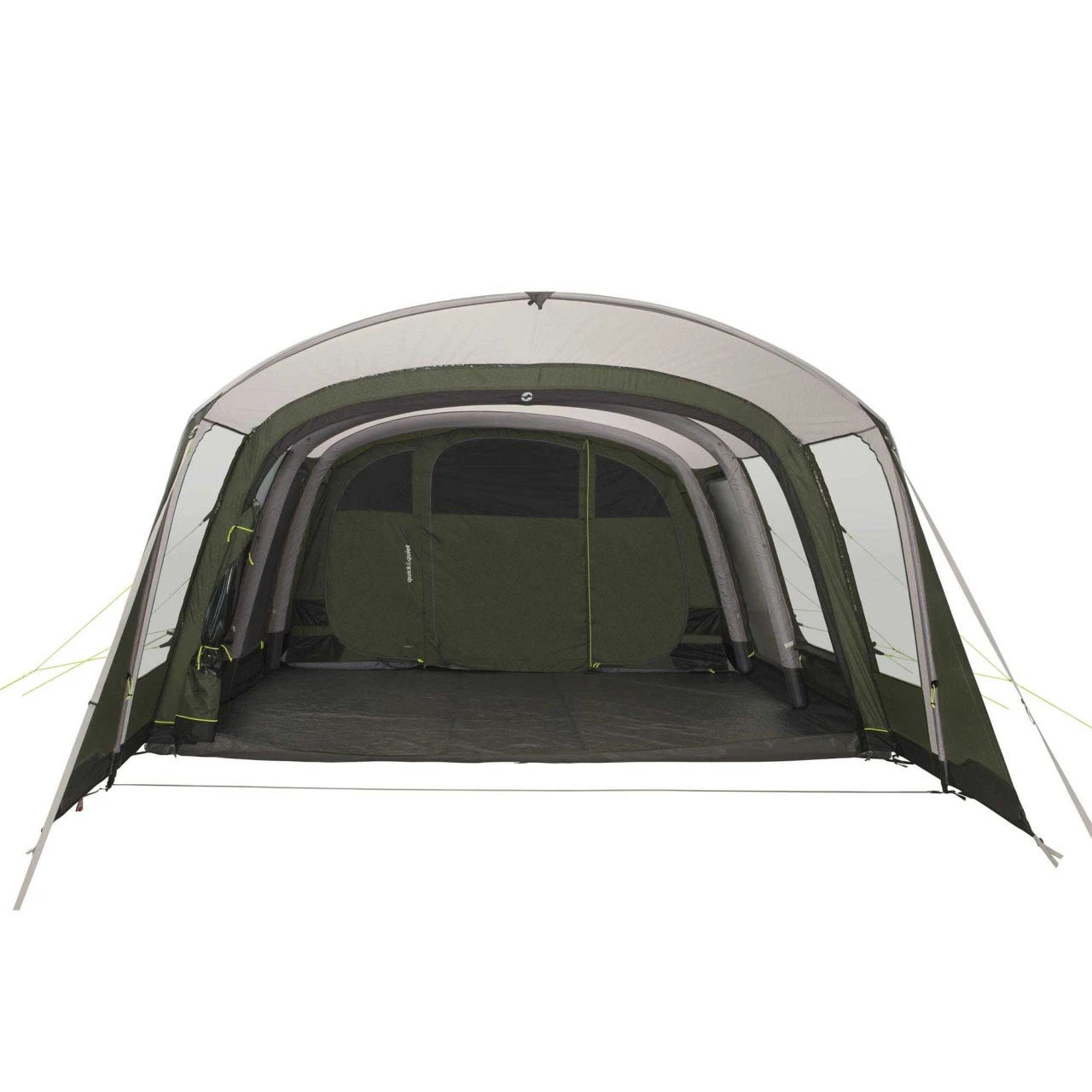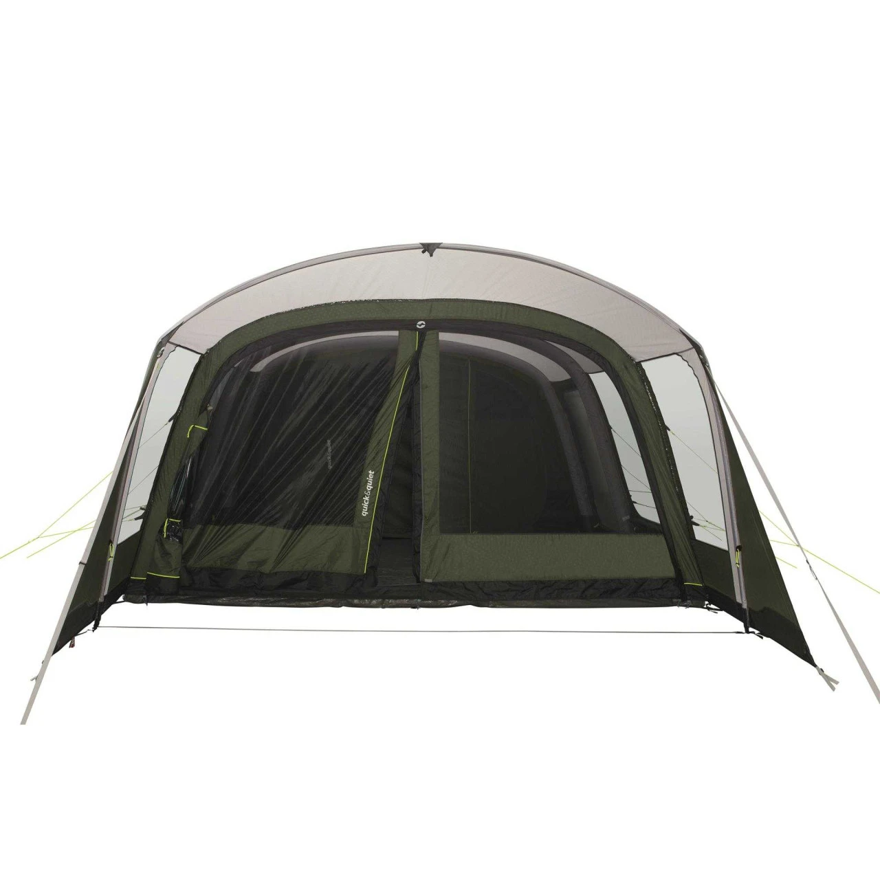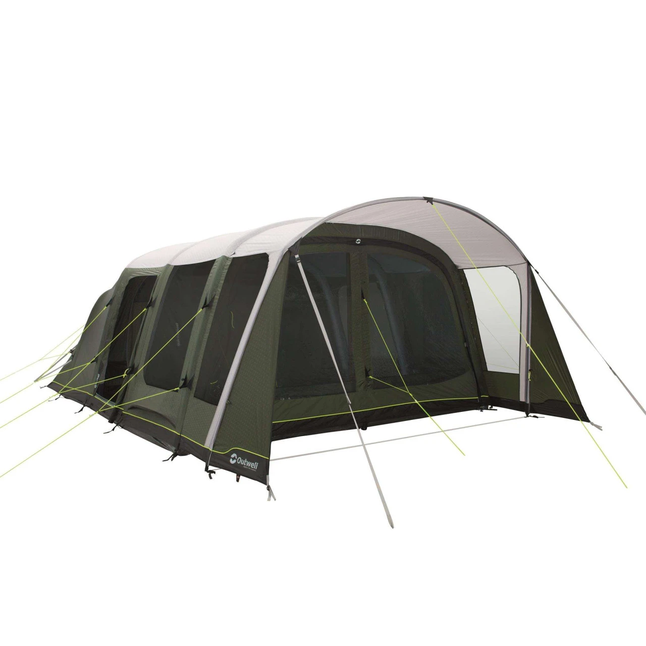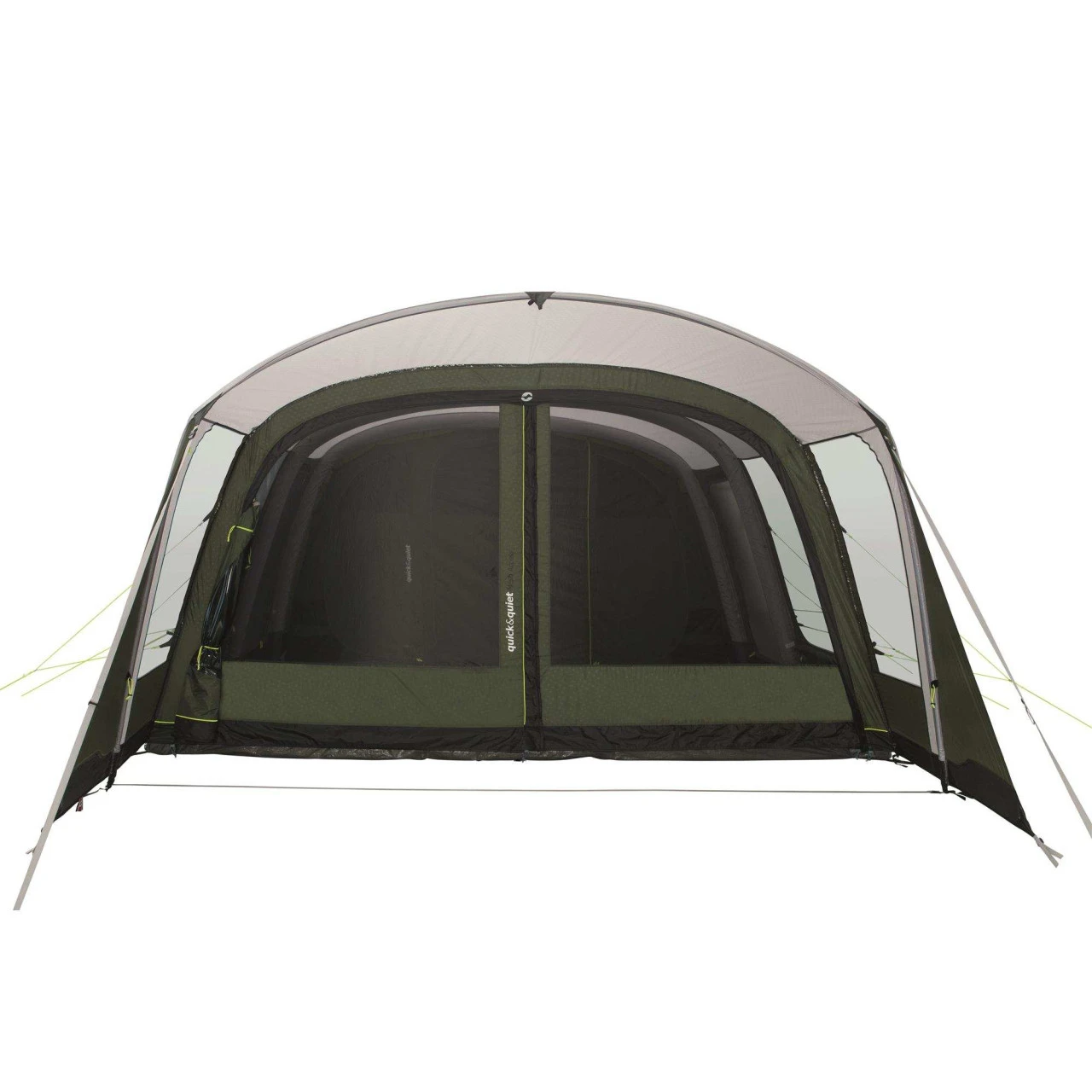 Das Outwell Avondale 6PA bietet ausreichend Platz für bis zu 6 Personen. Durch die einfach aufzublasenden Luftkanäle wird der Aufbau zum Kinderspiel. Das Vordach mit Fenstern in den Seitenwänden gewährt Schutz vor Sonne oder Regen. Die vorderen Paneele auf beiden Seiten können komplett zur Seite gerollt werden. Der große Haupteingang zum Outwell Avondale 6PA hat die patentierte Quick & Quiet Tür mit Moskitonetz bekommen. Damit kannst du den Eingang noch mehr nach deinen Wünschen gestalten – du kannst die Magnettür-Funktion nutzen oder den Eingang halb bzw. komplett öffnen. Ein weiterer Pluspunkt sind 2 separate Seiteneingänge, durch die du noch flexibler bei der Einrichtung deines Zeltes bist. Die Premium-Schlafkabine ist aus einem dunklen Material gefertigt, was für einen erholsamen Schlaf sorgt. Du kannst die Schlafkabine ganz einfach mit 2 Reißverschlussvorhängen in 2 oder 3 separate Kabinen teilen. Durch die Magnetfunktion der Quick & Quiet Tür kannst du das Innenzelt nahezu geräuschlos betreten oder verlassen. Möchtest du die Tür komplett verschließen, ist das auch kein Problem, denn ein Reißverschluss ist ebenfalls vorhanden. Die getönten Fenster lassen sich mit Vorhängen in verschiedenen Positionen schließen. Auf der Rückseite des Avondale 6PA befindet sich über die gesamte Breite eine Ventilation, die entweder komplett geöffnet werden kann oder mit Abstandshaltern so aufgestellt, dass auch bei schlechtem Wetter frische Luft ins Zelt kommt. Sollte es nachts doch zu kalt werden, kann die Belüftung auch komplett geschlossen werden.