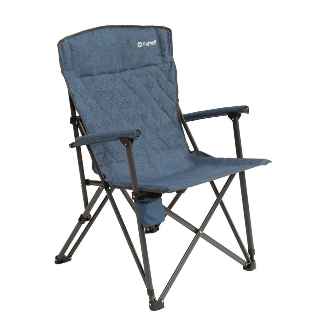 Der Outwell Derwent Campingstuhl ist Dank des gepolsterten Materials ideal für längere Urlaube. Die Rücken- und Kopflehne sind gepolstert und stützen die Wirbelsäule gut ab. Dank des geringen Gewichts lässt sich der Stuhl mühelos tragen. Er verfügt über einen hochfesten Rahmen für bessere Stabilität und lässt sich leicht auseinanderklappen. Der abnehmbare Getränkehalter kann nach dem Gebrauch unter der Sitzfläche aufbewahrt werden. Eine praktische Tragetasche ist im Lieferumfang enthalten.