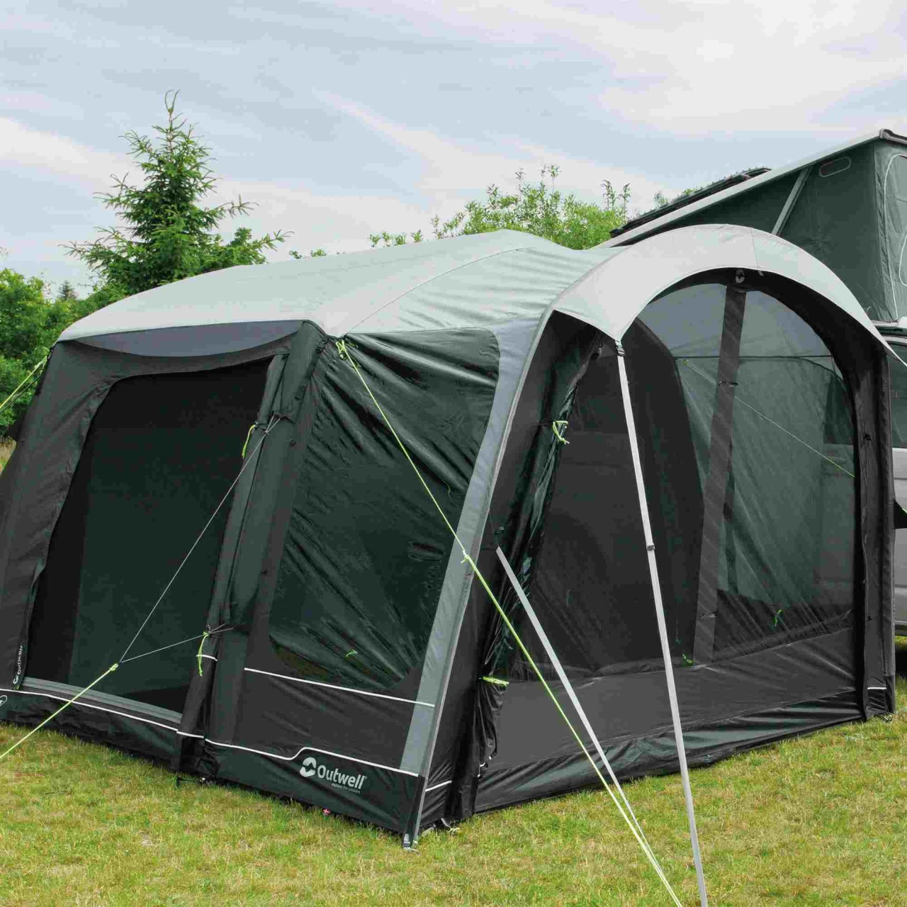 Das Outwell Jonesville 290SA Flex ist das am flexibel einsetzbarste Busvorzelt. Es lässt sich durch das Luftkanalgestänge schnell und einfach aufbauen und kann parallel an beiden Seiten des Fahrzeugs befestigt werden. Das besonders robuste und strapazierfähige Rip-Stop Material sowie die 6000 mm Wassersäule machen das Zelt komplett wasserdicht. Durch die Vier-Schieber-Reißverschlüsse in der Fronttür kannst du entscheiden, ob du die Tür halb oder ganz wegrollst oder ob du den Eingang nur mit einem Moskitonetz schützen möchtest. Wenn du einen größeren, geschützten Wohnraum möchtest, kannst du die große Eingangstür ganz einfach nach vorn versetzen. Durch die Seitentür, die auf der dem Fahrzeug abgewandten Seite liegt, bekommst du noch mehr Flexibilität in der Nutzung des Jonesvill 290SA Flex. Auch diese Seitentüren haben ein Moskitonetz hinter der Wand, was zur besseren Durchlüftung im Zelt dient. Mit der Optional erhältlichen, abgedunkelten Schlafkabine kannst du 2 zusätzliche Schlafplätze im Zelt schaffen. Der Zugluftstopper an der Bodenplane der Schleuse verhindert, dass es bei Wind und Wetter im Zelt zieht. Das HookTrack System ermöglicht es dir, Lampen oder andere Dinge bis zu 1,5 kg Gewicht flexibel im Zelt aufzuhängen und macht es somit noch wohnlicher.