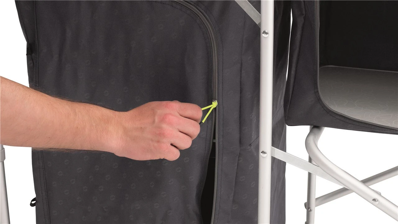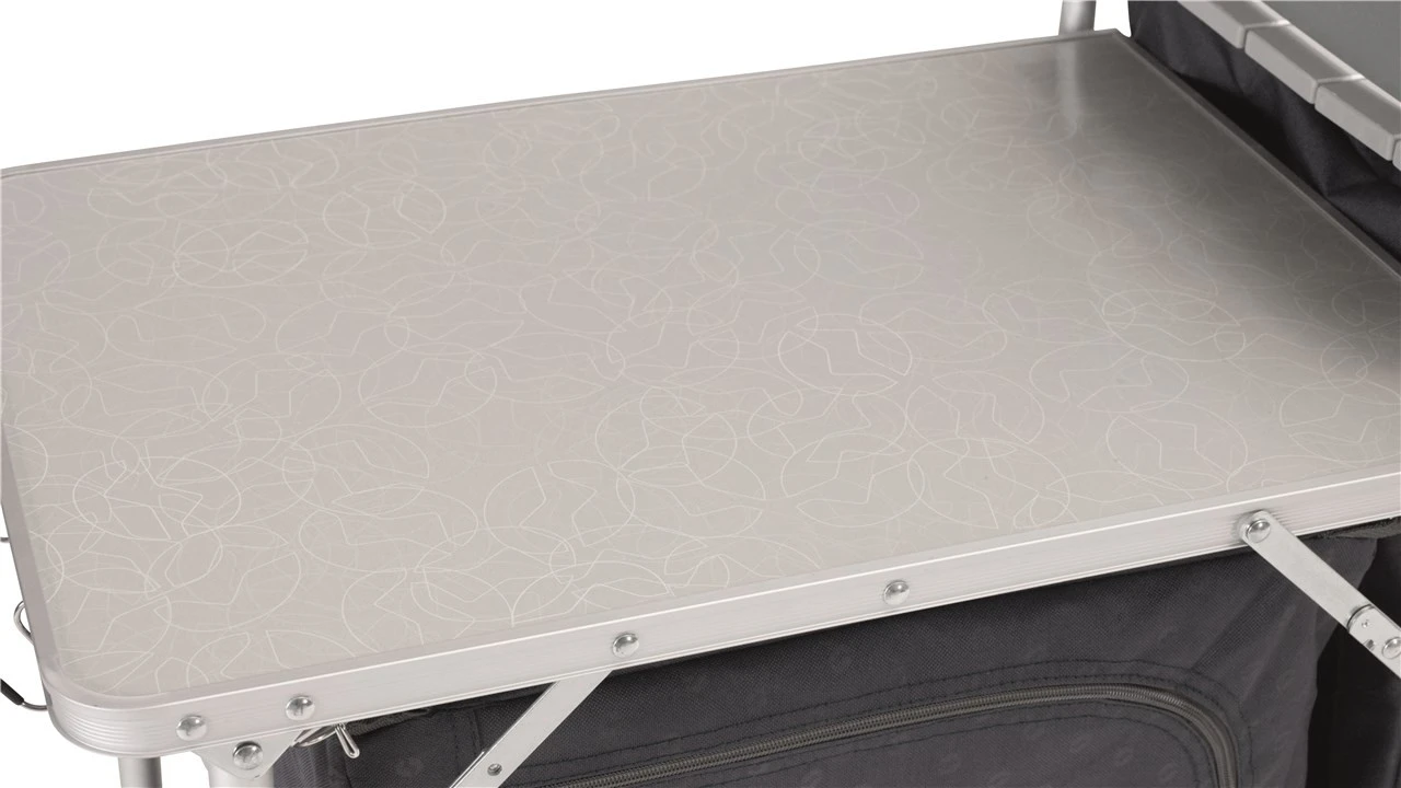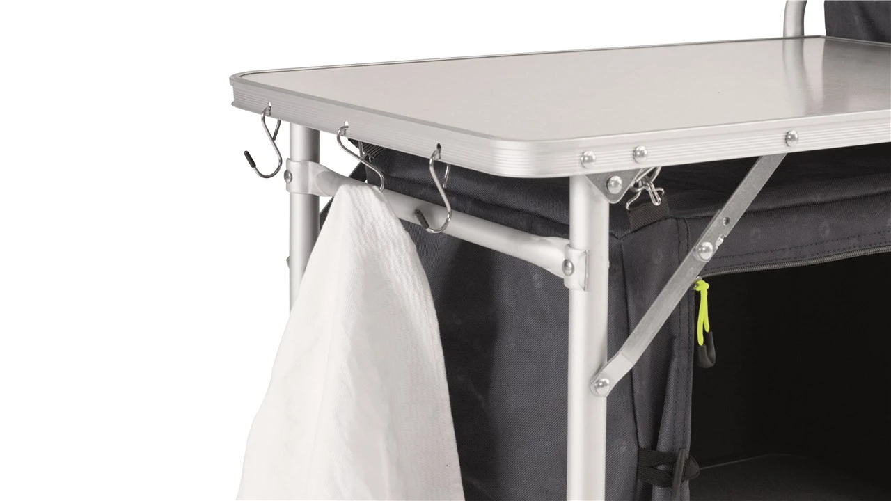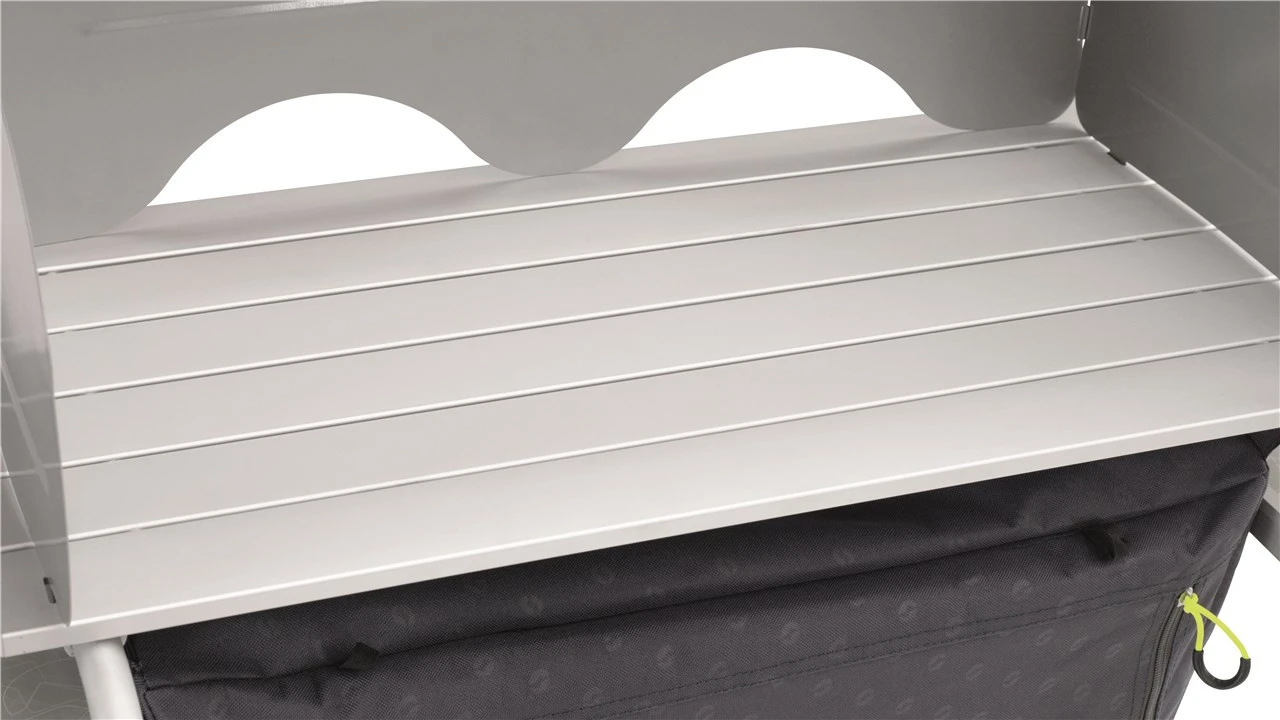 Der Outwell Paros Kitchen Table Küchentisch ist der ideale Tisch zum Campen. Auf den zwei Arbeitspatten in verschiedenen Größen kannst du deine Lebensmittel scheiden und Gerichte zubereiten. Er hat einen Schrank mit zwei Fächern auf der einen Seite und einen Schrank mit einem Fach auf der anderen. Beide Schränke haben eine Reißverschlusstür. Der Paros Kitchen Table besitzt drei Haken an der Arbeitsfläche, an denen du Handtücher aufhängen kannst. An einer Arbeitsplatte kann ein optionaler Windschutz für sicheres Kochen angebracht werden.