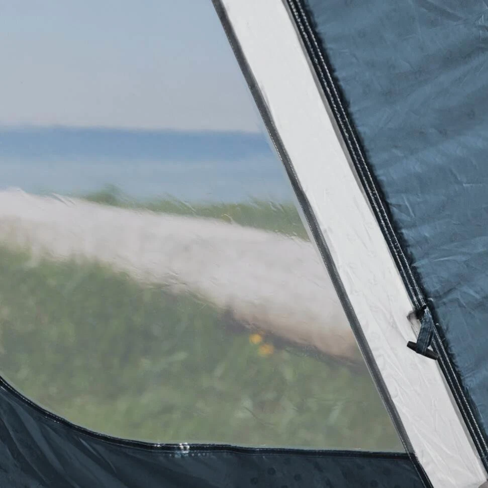 Die großen, getönten Fenster im Wohnbereich des Springwood 6SG haben den Vorteil, dass sie grelle Sonneneinstrahlung abmildern, aber auch vor direkten Blicken der Nachbarn schützen. Die Fenster können aber auch komplett geschlossen werden, indem die Vorhänge mit den Toggeln an den Ösen befestigst werden. Das helle Dach über dem Wohnbereich sorgt für eine angenehme, helle Atmosphäre im Zelt.