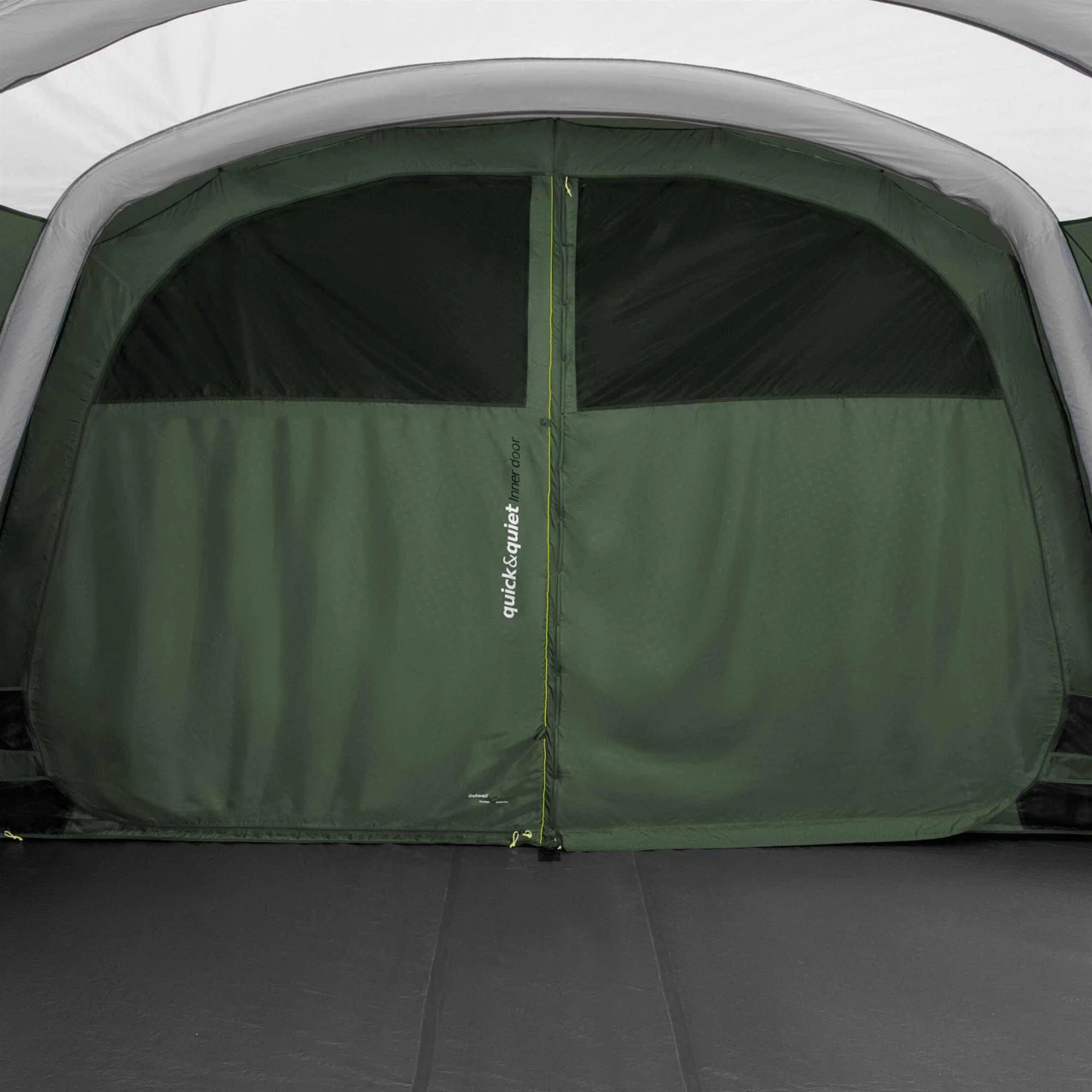 Der Eingang zum Wohnbereich ist mit der Quick & Quiet Door ausgestattet. Das Quick & Quiet System macht es dir leicht, dich im Zelt zu bewegen, denn der Magnetmechanismus sorgt für einen leisen und störungsfreien Zugang zum Sundale 5PA. Wenn du bei schlechtem Wetter den Nassbereich als Wohnraum nutzt, hilft dir der überdachte Seiteneingang dabei, trocken ins Zelt zu kommen. Um dir den Urlaub mit Zelt noch angenehmer zu machen, gibt es auf der anderen Seite des Wohnraums noch einen zweiten Seiteneingang. Die großen Fenster sind getönt und halten so die direkte Sonneneinstrahlung ab. Bei Bedarf kannst du einfach die Vorhänge hochrollen und die Fenster komplett verschließen. Das Dach über dem Wohnbereich ist aus einem hellen Material hergestellt und schafft so ein helles, angenehmes Wohnambiente im Zelt.