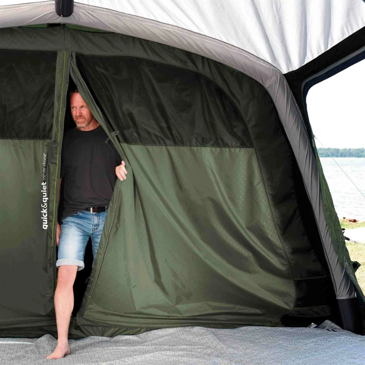 Die Premium Schlafkabine ist, wie der Wohnraum, auch mit einer Quick & Quiet Door ausgestattet, so dass du nachts beim zu Bett gehen keinen Mitcamper weckst. Du kannst den Zugang aber auch wie eine herkömmliche Zelt Tür nutzen und Insektensicher mit einem Reißverschluss verschließen. Mit einem Reißverschlussvorhang kannst du das Innenzelt in zwei einzelne Schlafkabine teilen. Im Bereich des Bodens ist der Vorhang aber immer offen, so dass ein Kind durchkrabbeln kann, wenn es nicht schlafen kann. Das dunkle Material an den Wänden und der Decke der Schlafkabine erhöht den Schlafkomfort, denn es hält die hellsten Sonnenstrahlen draußen.