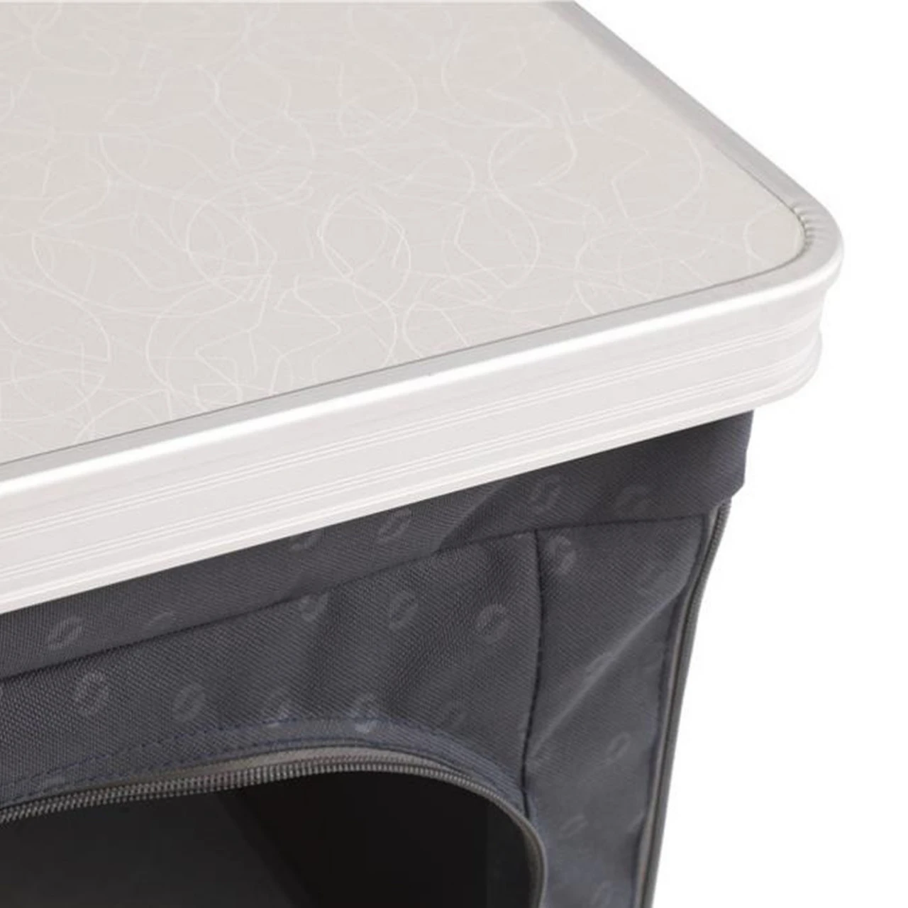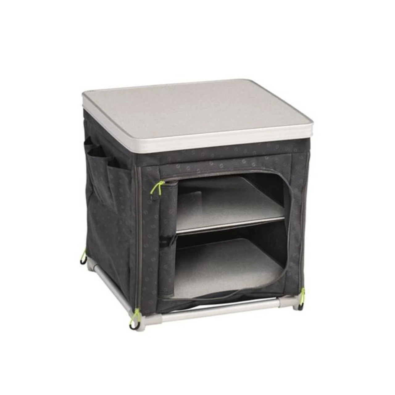 Der Outwell Tinos Campingschrank organisiert Deine Habseligkeiten im Handumdrehen. Die beiden Regalfächer sind mit Reißverschlusstüren ausgestattet. Drei Taschen an jeder Seite des Schranks sind ideal für Kleinigkeiten wie Deinen Schlüssel und Dein Handy. Für einen unkomplizierten Transport sorgt das kleine Packmaß und die Tragetasche, in die Du den Tinos Campingschrank packen kannst.