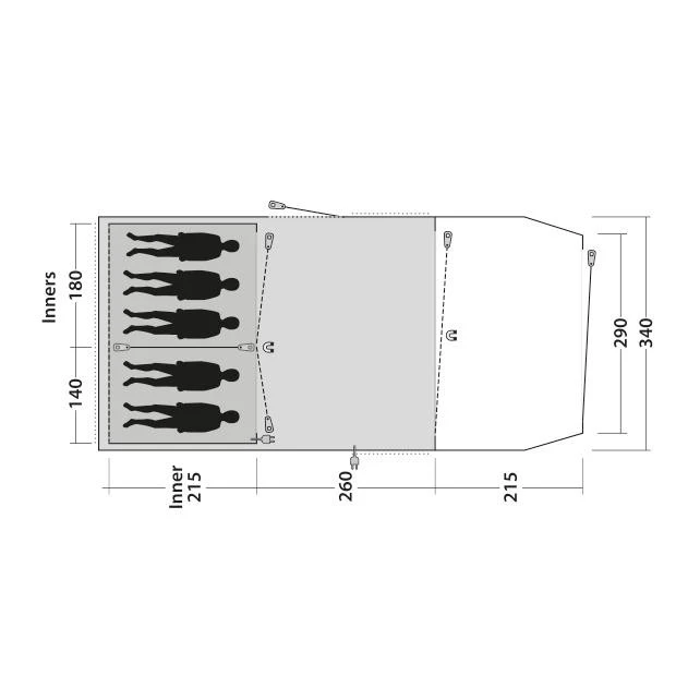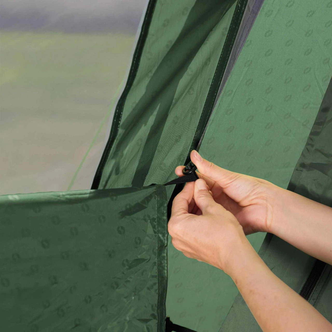 Der Eingang zum Wohnbereich ist mit der Quick & Quiet Door with Mesh ausgestattet. Das Quick & Quiet System macht es dir leicht, dich im Zelt zu bewegen, denn der Magnetmechanismus sorgt für einen leisen und störungsfreien Zugang zum Westwood 5. Die Türen können seitlich aufgerollt und befestigt werden. Du kannst den Eingang mit dem doppelten Reißverschluss aber auch am eingenähten Boden festmachen und das Zelt komplett verschließen. Die großen Fenster sind getönt und halten so die direkte Sonneneinstrahlung ab. Bei Bedarf kannst du einfach die Vorhänge hochrollen und die Fenster komplett verschließen. Das Dach über dem Wohnbereich ist aus einem hellen Material hergestellt und schafft so ein helles, angenehmes Wohnambiente im Zelt.
