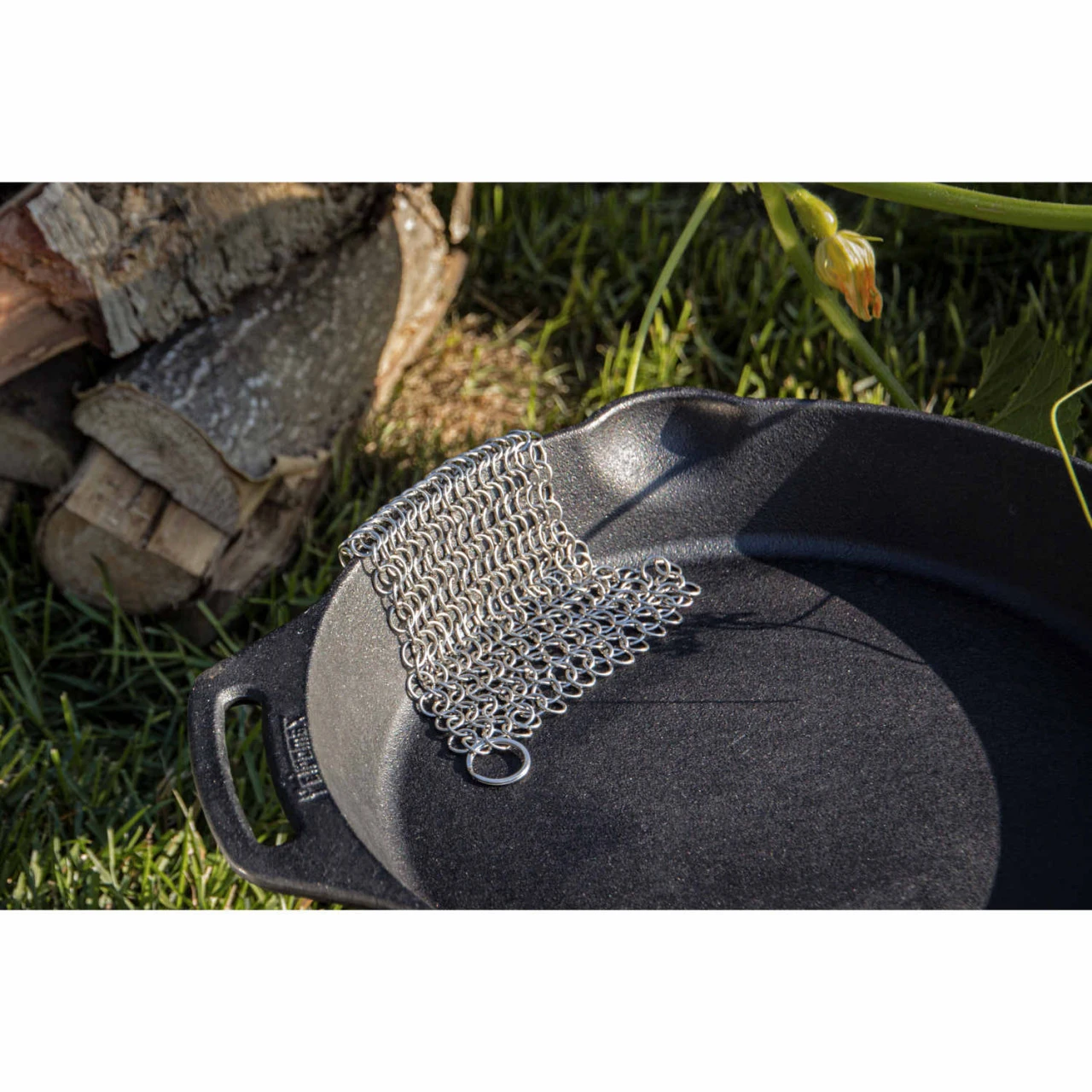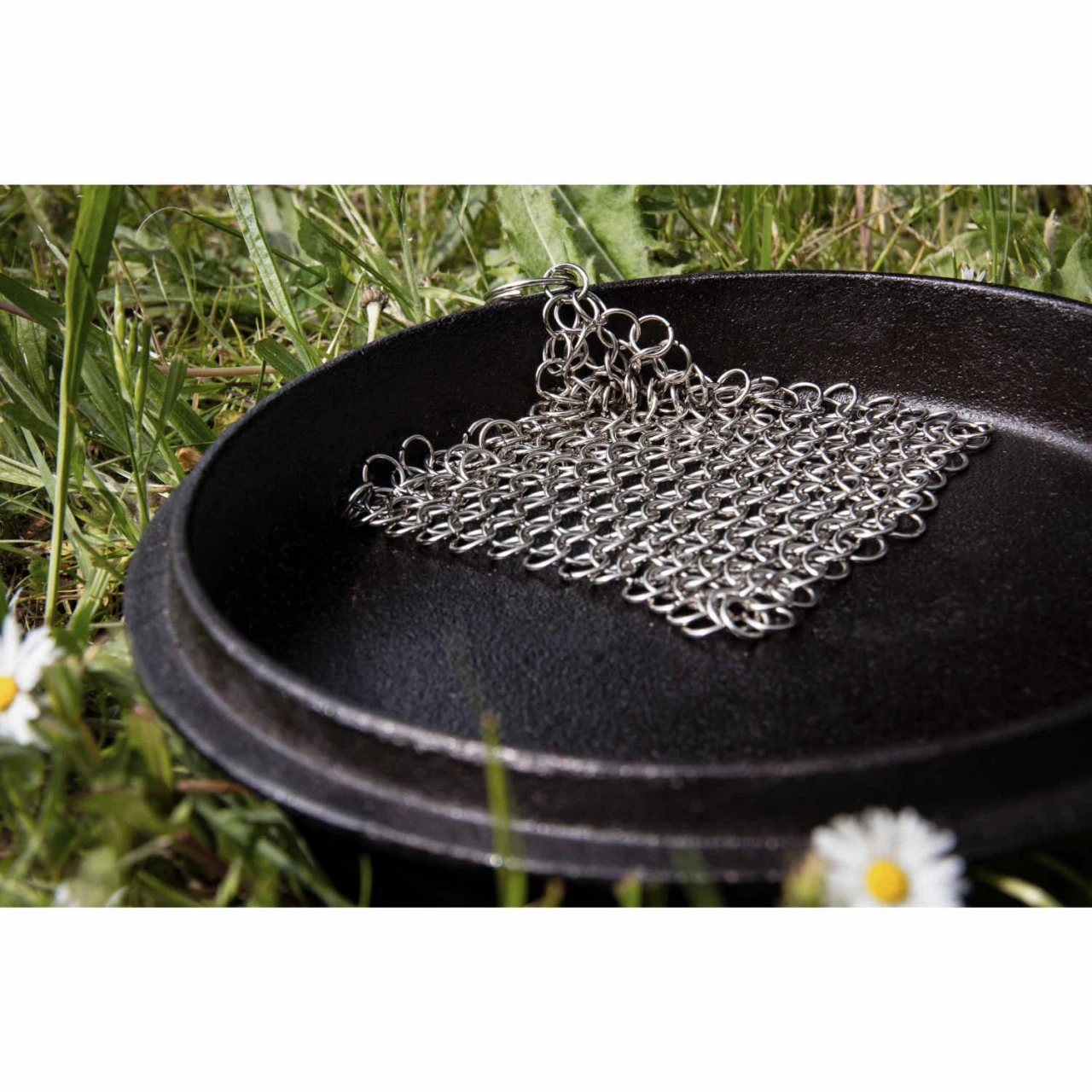 Dieses hochwertige und strapazierfähige Utensil aus Edelstahl reinigt mühelos Gusseisen, Schmiedeeisen und Edelstahl ohne die wertvolle Patina zu beschädigen. Das Kochgeschirr einfach abkühlen lassen und mit warmem Wasser schonend die angebrannten Essensreste abreiben. Spülmittel wird nicht benötigt. Nach dem Säubern nochmals abspülen und vor dem Verstauen gut abtrocknen, sonst ist Kontaktkorrosion möglich ist.