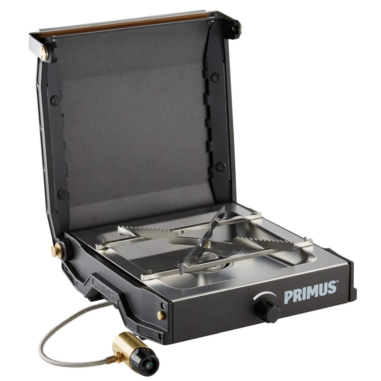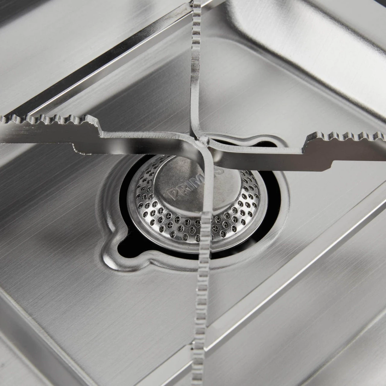 Der Primus Moja Stove ist ein Einflammenkocher, der sowohl als Single Kocher als auch als Ergänzung zu einem weiteren Kocher genutzt werden kann. Da der Deckel abgenommen werden kann, können auch größere Pfannen oder Töpfe benutzt werden. Außerdem kann von allen Seiten gekocht werden. Der Deckel kann aber auch als Windschutz dienen. Die Topfauflage und die Abtropfschale sind auch hochwertigem Edelstahl gefertigt und können zum Reinigen ganz einfach entfernt werden. Der elegante, holzbeschichtete Tragegriff dient gleichzeitig als Verschluss.