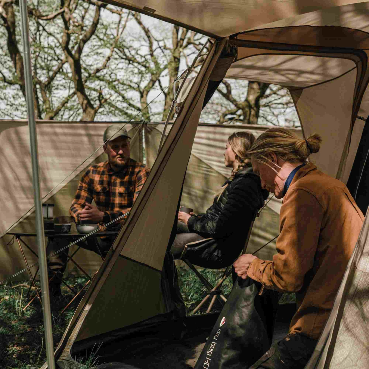 Im Double Dreamer 5 von Robens finden bis zu 5 Personen Platz. Der geräumige Wohnbereich kann sogar noch etwas vergrößert werden, denn die Tür des Fronteingangs kann mit optional erhältlichen Aufstellstangen zu einem Sonnensegel ausgestellt werden. Wenn im Eingangsbereich Möbel aufgestellt sind, kann das Zelt auch durch den überdachten Seiteneingang betreten werden.