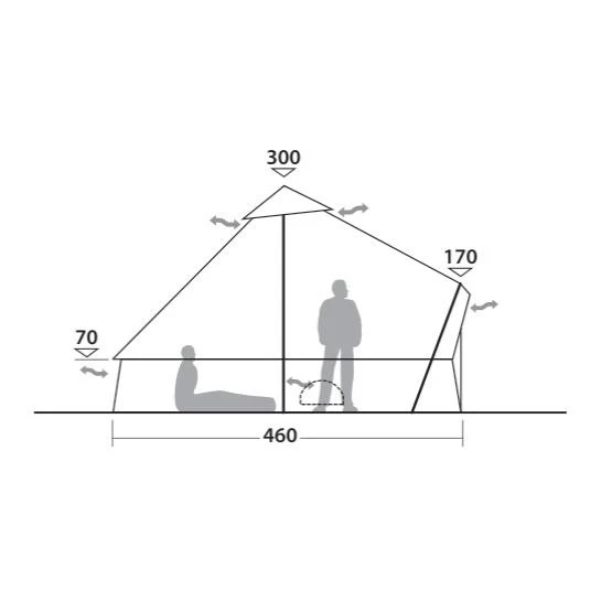 In der geteilten Eingangstür sind auf jeder Seite Moskitonetze eingearbeitet. Durch den Vorhang, der mit einem Reißverschluss versehen ist, lässt sich die Luftzufuhr stufenlos steuern. In den Wänden sind im Bodenbereich 3 Belüftungen mit Moskitonetz eingelassen, die sich mit einem Vorhang mit Reißverschluss individuell schließen lassen. Die Dachbelüftung wird mit Hilfe von zwei Leinen neben der Tür gesteuert.