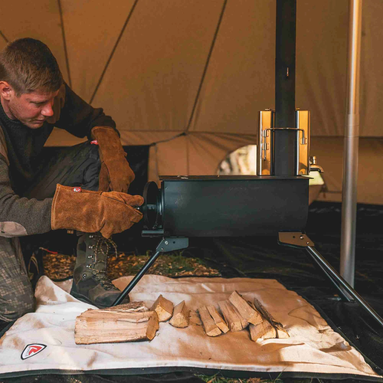 Der wasserdichte Zeltboden kann bei Bedarf komplett herausgezippt werden. Wenn er im Zelt liegt, sorgt er für einen trockenen, sauberen Bereich im Zelt. Vier Reißverschluss-Schieber schaffen vom Eingang bis in die Zeltmitte einen Bereich, in dem im Winter ein Zeltofen aufgestellt werden kann, oder der als Nassbereich für schmutzige Schuhe und Ausrüstung dient.