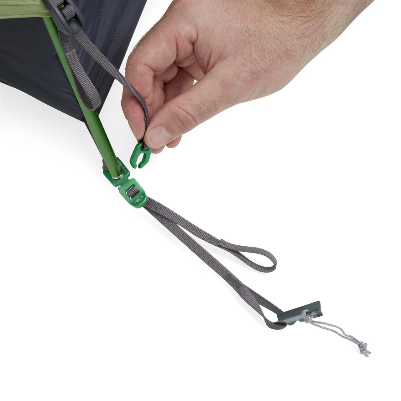 Das DAC Featherlite Aluminiumgestänge ist komplett verbunden und an den Enden farblich markiert, so dass der Aufbau sehr einfach ist. Die farblich markierten Stangenenden werden in die dafür vorgesehenen Enden am Zelt gesteckt. Sea to Summit hat die Quick-Connect Pole Feets noch weiter verfeinert. Gefräste Aluminium-Clips machen das Befestigen des Außenzeltes schnell und einhändig möglich und sie sind zudem noch deutlich haltbarer als herkömmliche Kunststoffschnallen.