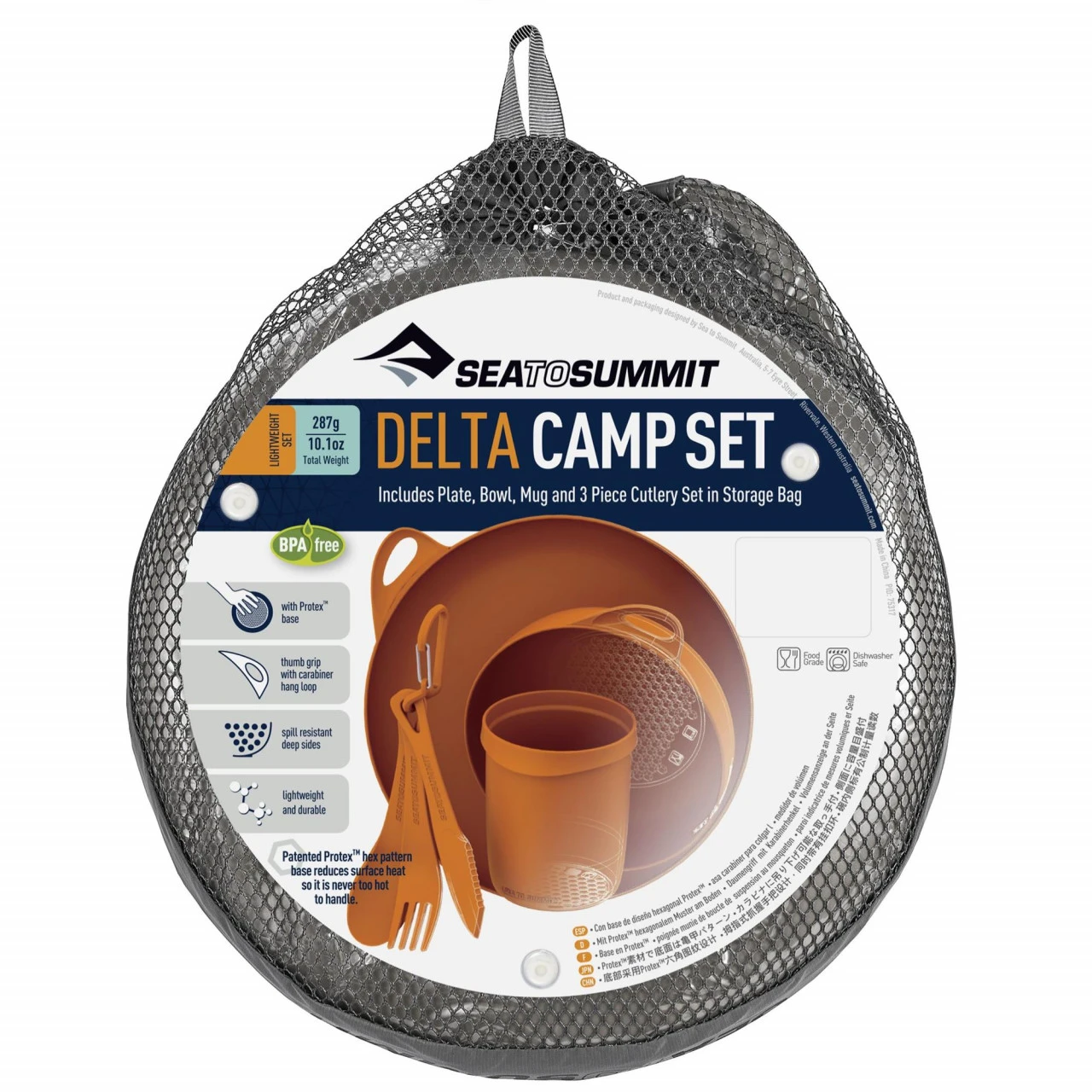 Das Sea to Summit Delta Camp Set gibt es im praktischen Mesh-Beutel mit Kordel. Es beinhaltet Teller, Schale, Becher und ein dreiteiliges Besteckset. Das Essgeschirr ist spülmaschinenfest und geruchsneutral.