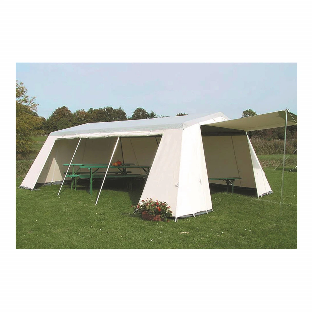 Das Tortuga Alabama Gr.3 Gruppenzelt ist ein klassisches Gerüstzelt. Sie können sowohl den Eingang, die Rückwand und die linke Seitenwand komplett aufrollen und als Vordach aufstellen, sodass Sie über einen luftigen und schattigen Aufenthaltsraum verfügen. Die Mittelhöhe von 215 cm bietet eine komfortable Kopffreiheit, vor allem wenn Sie eine Bierzeltgarnitur in dem Gerüstzelt aufgestellt haben. Die Baumwollzeltwand und die abgedeckten Moskitotüllfenster sorgen mit der Hochentlüftung im Vorder- und Hintergiebel für eine angenehme Ventilation. Nach dem BBQ können bis zu 20 Personen in dem Gerüstzelt nächtigen. Das Tortuga Alabama Gr.3 Gruppenzelt ist deshalb eine praktische Ausrüstung, die nicht nur als Lager überzeugt.