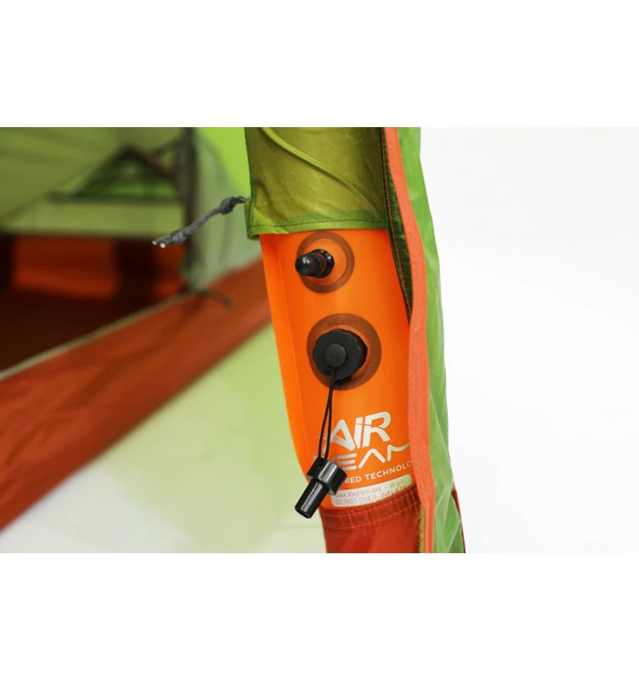 Das F10 Helium UL Air besitzt ein aufblasbares Luftgestänge. Mit Hilfe des Pumpsackes von Vango, kannst du dein Zelt ganz einfach mit deiner Fahrradpumpe aufpumpen. Neben einer Mesh-Belüftungsöffnung ist auch die Tür mit einem Moskitonetz ausgestattet. Das führt In Kombination mit dem atmungsaktiven Nylon-Innenzelt zu einem angenehmen Klima im Zeltinneren. Optional sind eine zusätzliche Bodenplane, benötigt um das Zelt ohne Schafkabine zu nutzen, und eine Aufstellstange für den Eingang, um zusätzlichen Stauraum zu schaffen