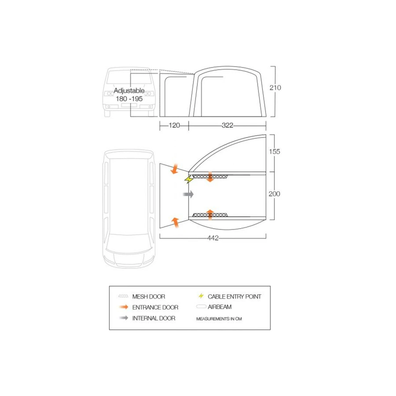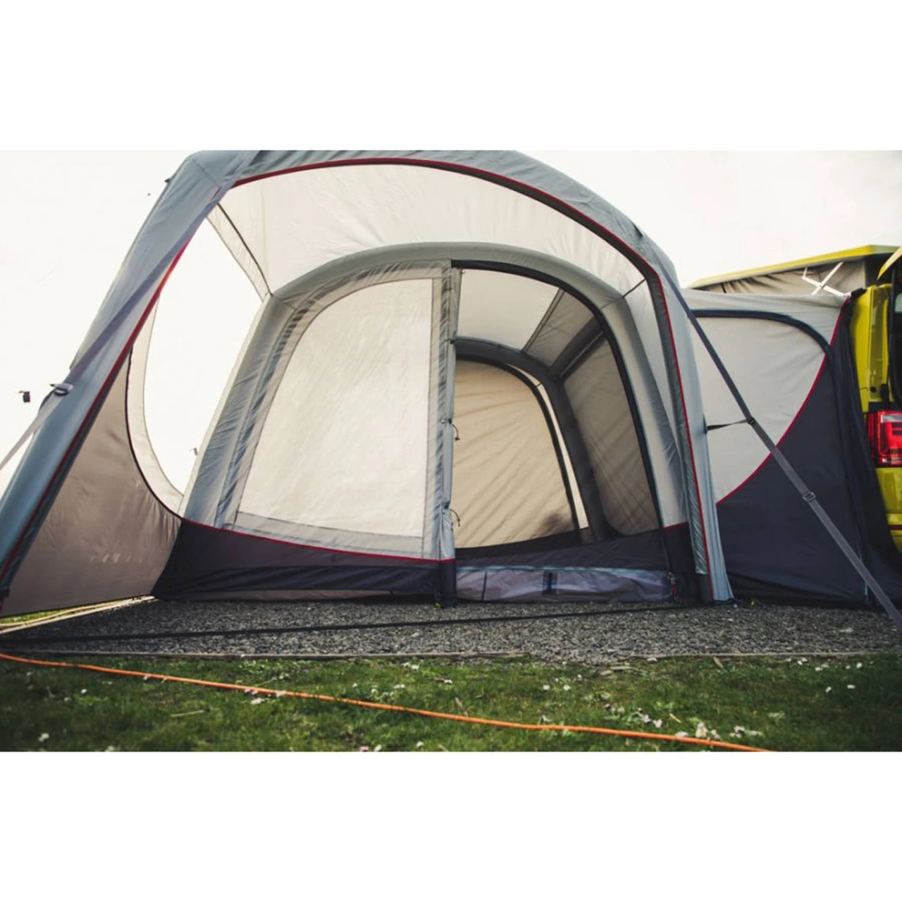 Das Vango Magra Air VW Busvorzelt ist ein freistehendes Vorzelt mit vorgeformten AirBeam® Luftgestänge und AirSpeed Ventilen, dass sich besonders gut für Vans, Busse und Kastenwagen mit einer Anschlusshöhe von 180-205 cm eignet. Du kannst es sowohl mit Gurten, Kederschienen, Regenrinnen und Reling an beiden Seiten Deines Fahrzeugs befestigen. Es besteht aus dem federleichten Sentinel-Sport Material und macht Deinen Campingurlaub mit Sicherheit sehr erholsam. In das Innere des Zeltes gelangst Du über einen der zwei überdachten, seitlichen Eingänge oder über die beiden Verbindungsschleuseneingänge. Die Eingänge sind zusätzlich mit einem Moskitonetz ausgestattet. Somit ist es Dir möglich, Dein Zelt zu lüften, ohne das Insekten hineinkommen können. Im Inneren sorgen die Fenster Folien Diamond Clear / Pro Clear PVC-Fenster, für ausreichend Helligkeit und einen schönen Ausblick aus dem Zelt ins Grüne. Möchtest Du hingegen mehr Privatsphäre genießen, kannst Du die Fenster mit den Vorhängen abdunkeln. Für eine optimale Belüftung Deines Magra Air VW sorgt das vergrößterte AirZone™ System. Dieses System ist in den oberen und unteren Bereichen der Zeltwände integriert und sorgt so für ein gutes Zeltklima. Außerdem verfügt das Vorzelt über eine SkyTrack™ II Fixierung, mit der Du den Innenhimmel und Organizer befestigen kannst.