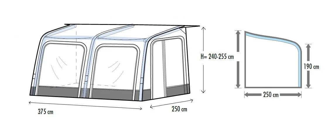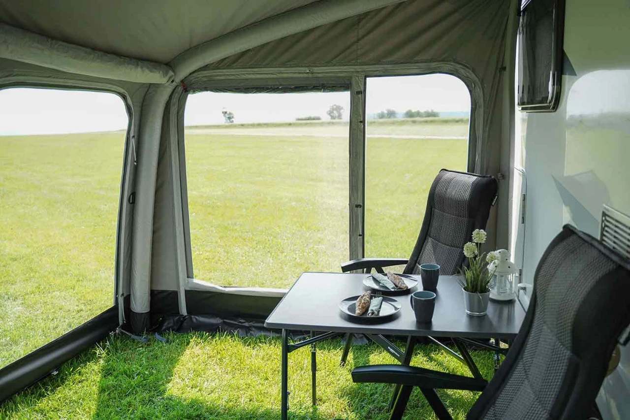 Du bist viel unterwegs, wechselst oft deinen Standort oder machst eine Rundreise? Dann ist das Westfield Vega 375 Wohnwagenvorzelt genau das richtige Vorzelt für dich. Es lässt sich durch das Advanced Air System® an nur einem Punkt in wenigen Minuten aufpumpen. Es besteht außerdem aus dem reißfesten und strapazierfähigen HydroTech® CottonTouch-Material, welches speziell für Caravan und Reisemobile entwickelt wurde. Dieses Polyestergewebe ist besonders UV-beständig. Des Weiteren verleiht diese Beschichtung dem Zelt einen fühlbaren Baumwoll-Charakter. In das Innere des Zeltes gelangst du durch eine der Türen in der Front-oder Seitenwand. Das Vega 375 bietet durch seine Tiefe von 250 cm einen sehr geräumigen Innenraum, indem du viel Platz hast. Durch die Fenster in der Front und in den Seitenwänden kommt viel Licht in das Innere des Zeltes und du kannst einen wunderschönen Panoramablick genießen. Die Seitenwände sind mit einem Moskitonetz ausgestattet, sodass Insekten nicht ins Innere gelangen können. Für ein gutes Zeltklima sorgt neben den getönten Fenstern auch die dauerhafte Hochentlüftung, sodass in deinem Zelt ein angenehmes Klima herrscht.