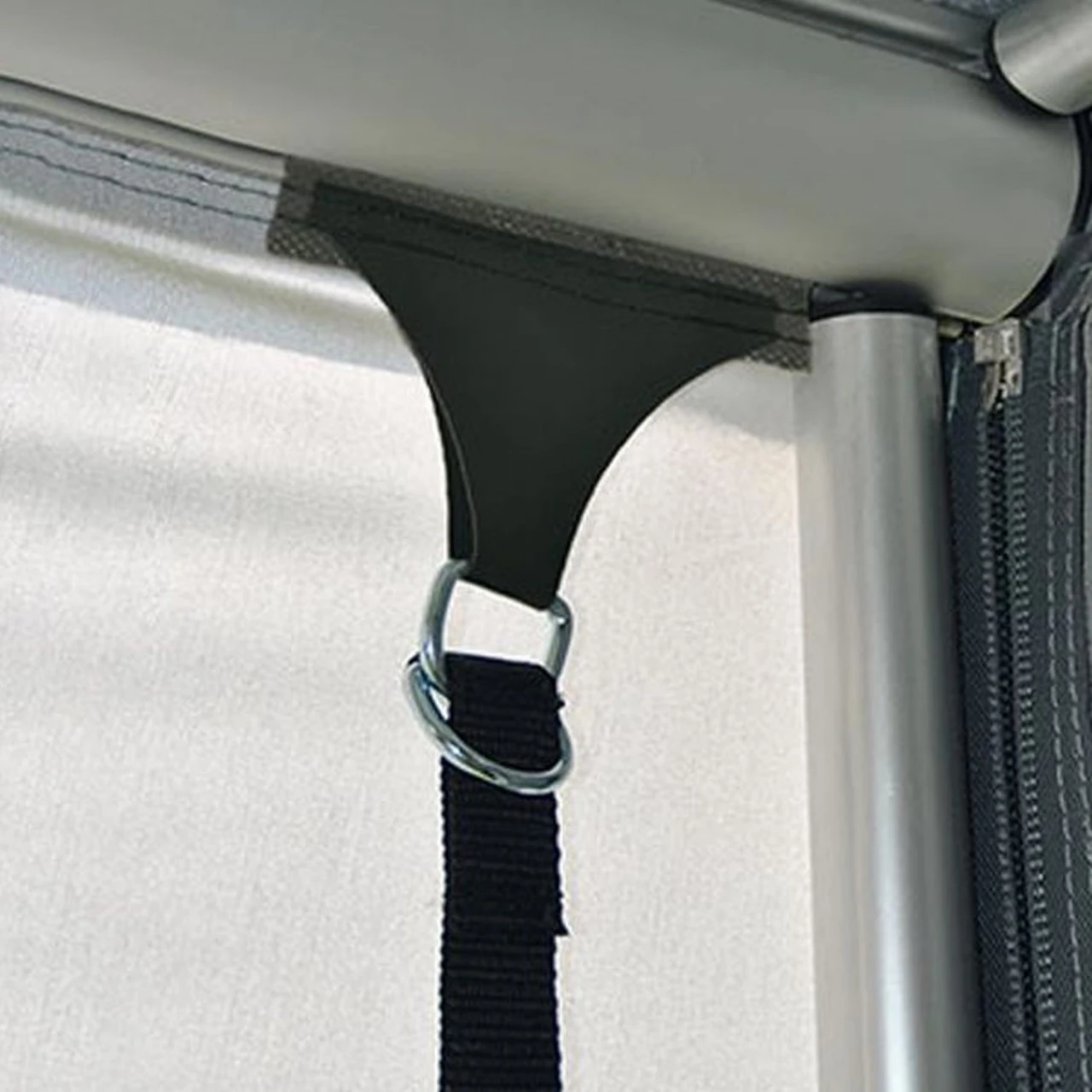 Zur zusätzlichen Absicherung im Innenbereich, wird die zusätzliche Abspannvorrichtung mittels Keder in das Profil eingezogen und zum Boden mit Abspannleinen hin abgespannt.